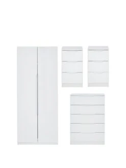 This great value Ready Assembled 4 Piece Monaco Gloss Bedroom Furniture Package contains a 2 Door Wardrobe, Chest of 5 Drawers and a Pair of 3 Drawer Bedside Chests