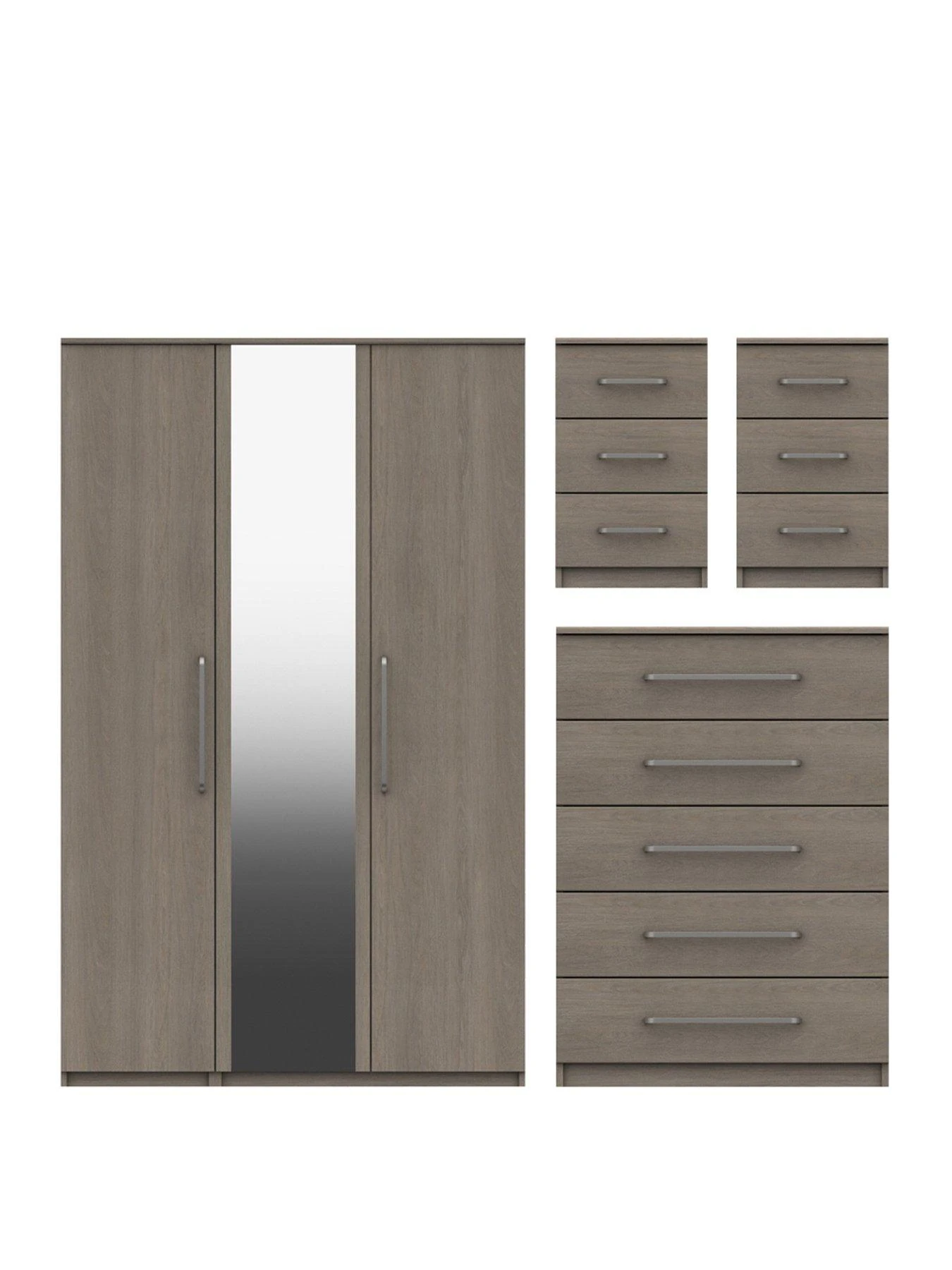 This great value 4 Piece Part Assembled ReagonĀ Bedroom Furniture SetĀ comprises a 3 Door Mirrored Wardrobe, Chest of 5 Drawers and a Pair of 3 Drawer Bedside Chests