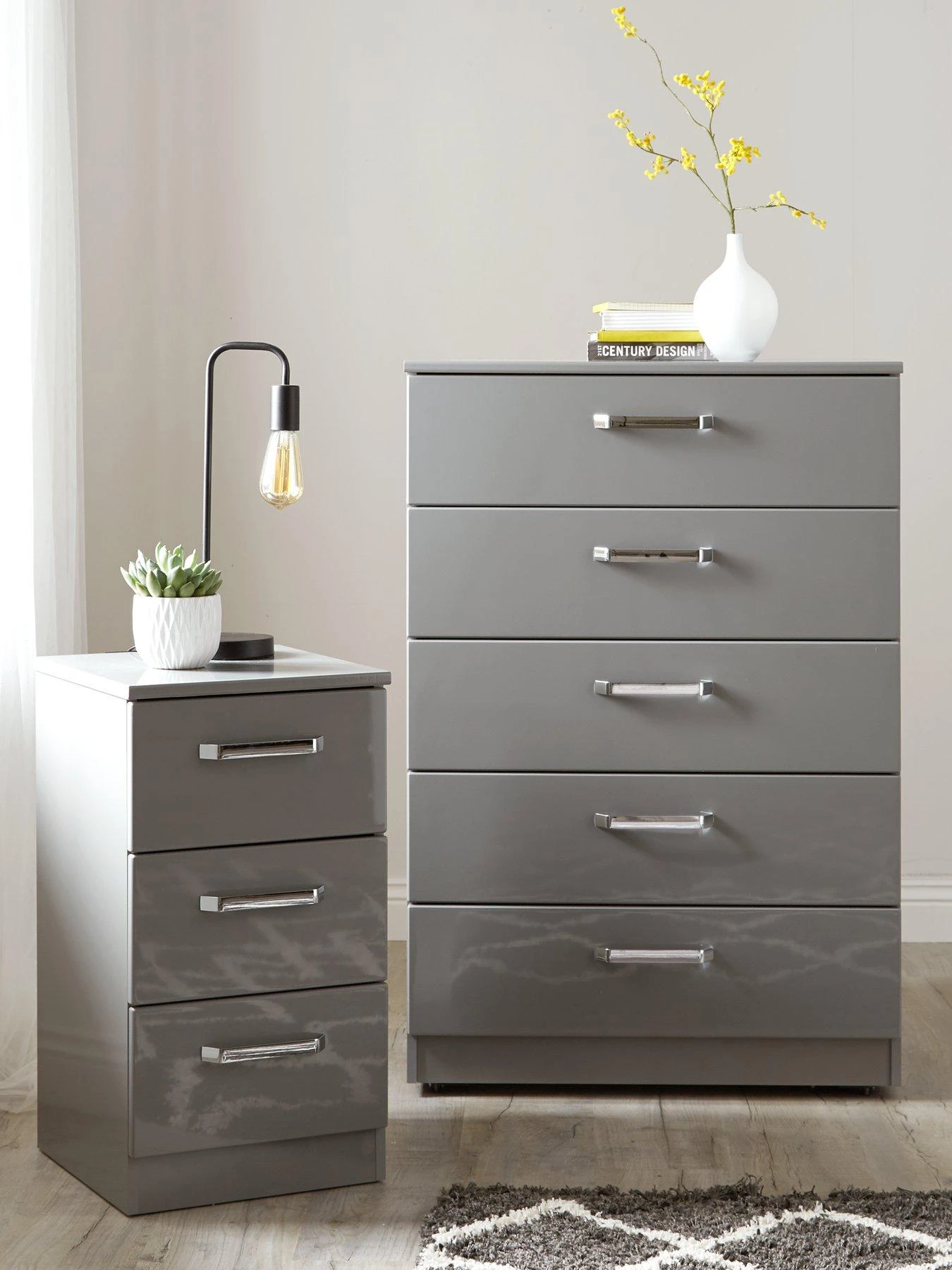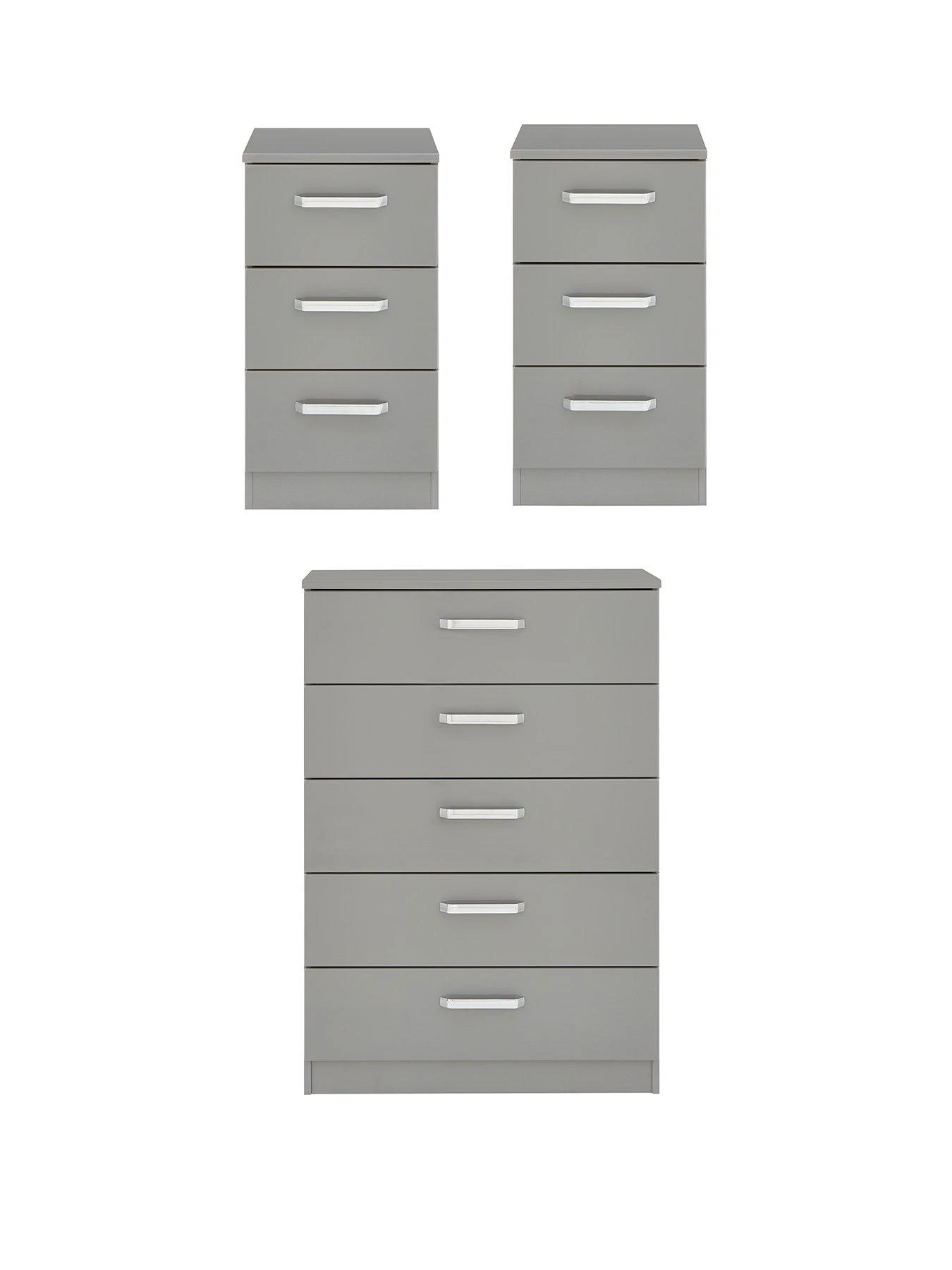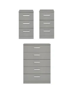 Sanford High Gloss Ready Assembled 3 Piece Package – Chest of 5 Drawers and 2 Bedside Chests