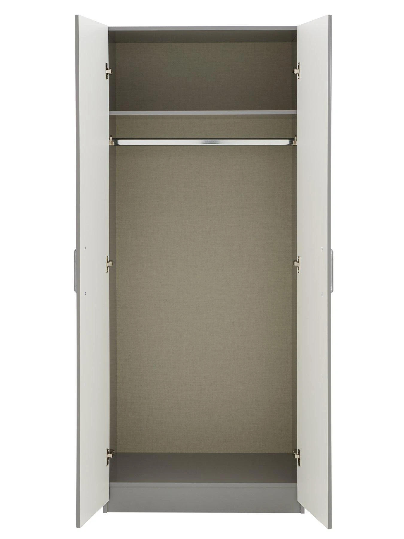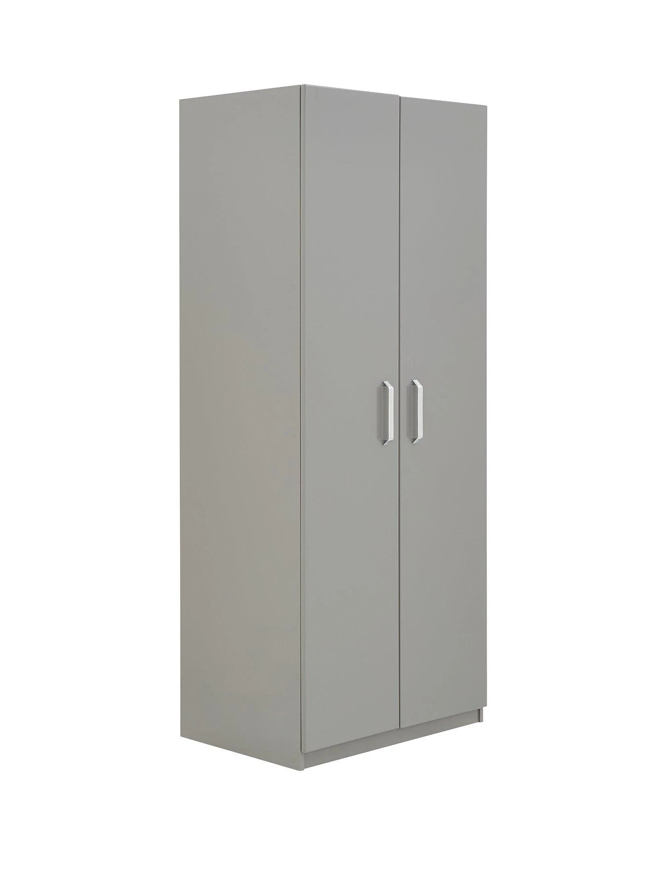 The wardrobe contains a hanging rail and high shelf, while adjustable metal hinges allow for easy alignment on uneven floors.