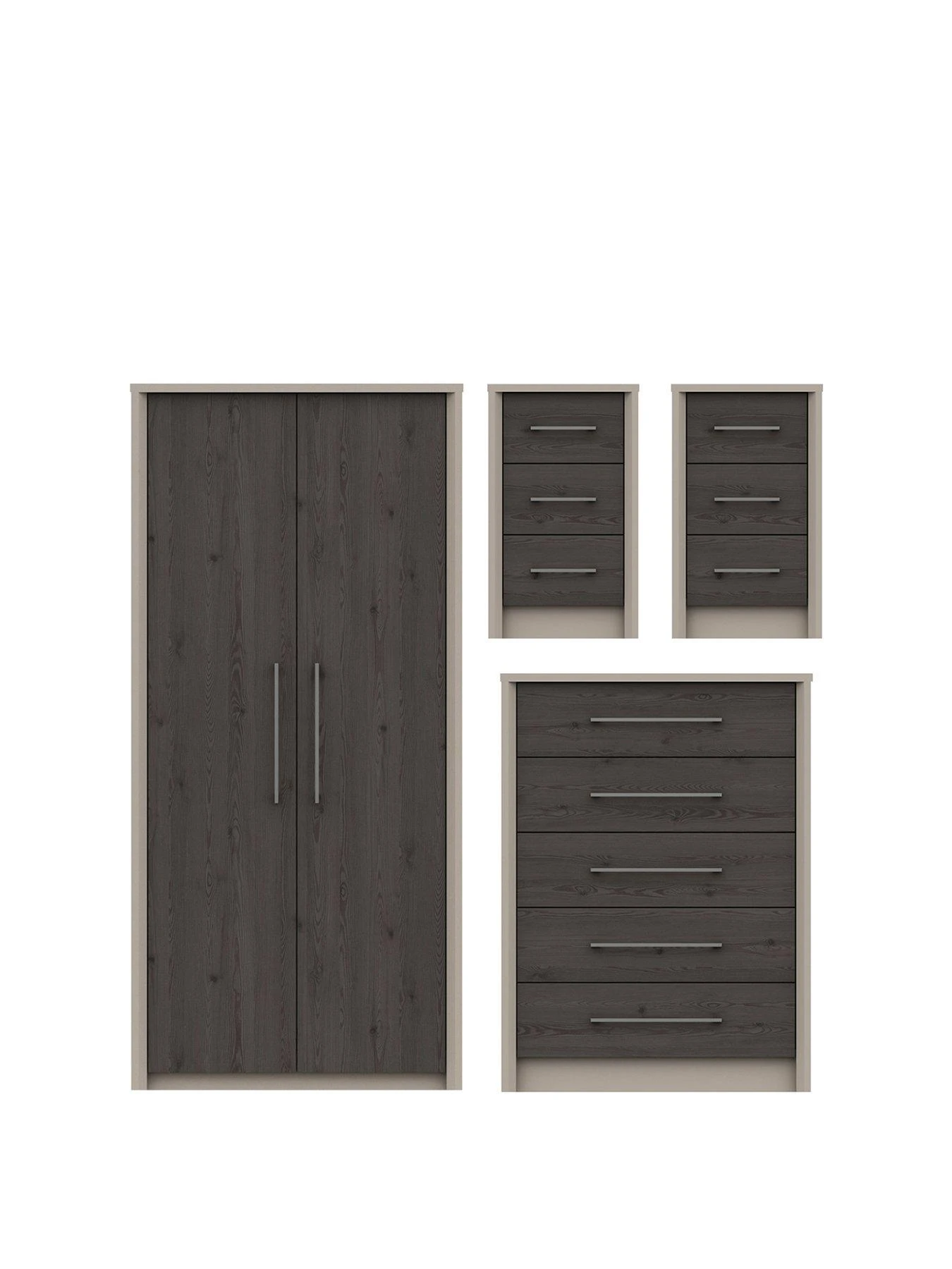This great value for money 3 Piece Ready Assembled Bedroom Furniture Set from our Smyth Collection contains a 2 Door Wardrobe, Chest of 5 Drawers plus a pair of 3 Drawer Bedside Chests
