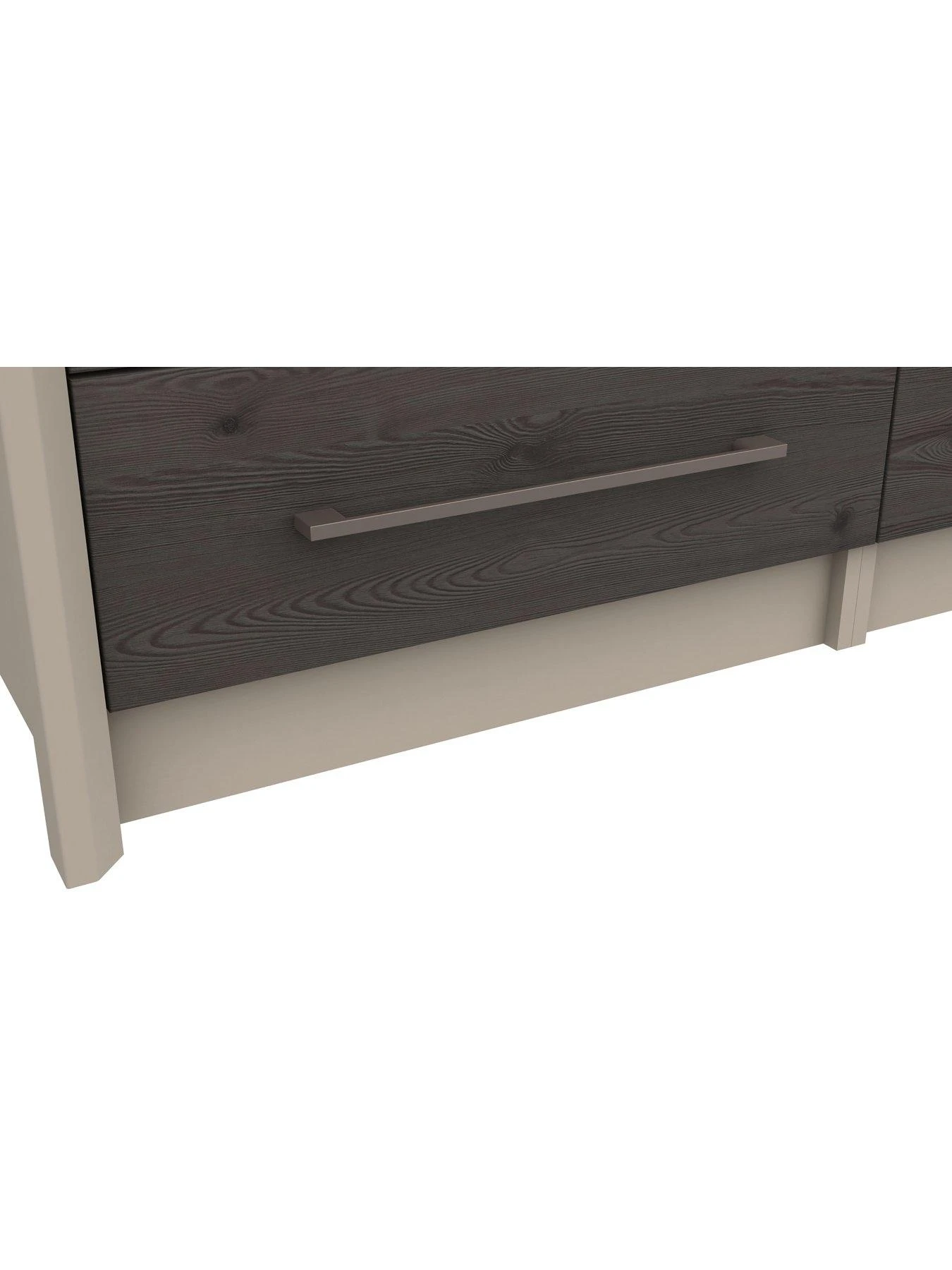 The taupe frames boast smartly angled front edges, and the colour contrasts eye-catchingly with grained-effect doors and drawer fronts – these come in a choice of light grey or dark grey.