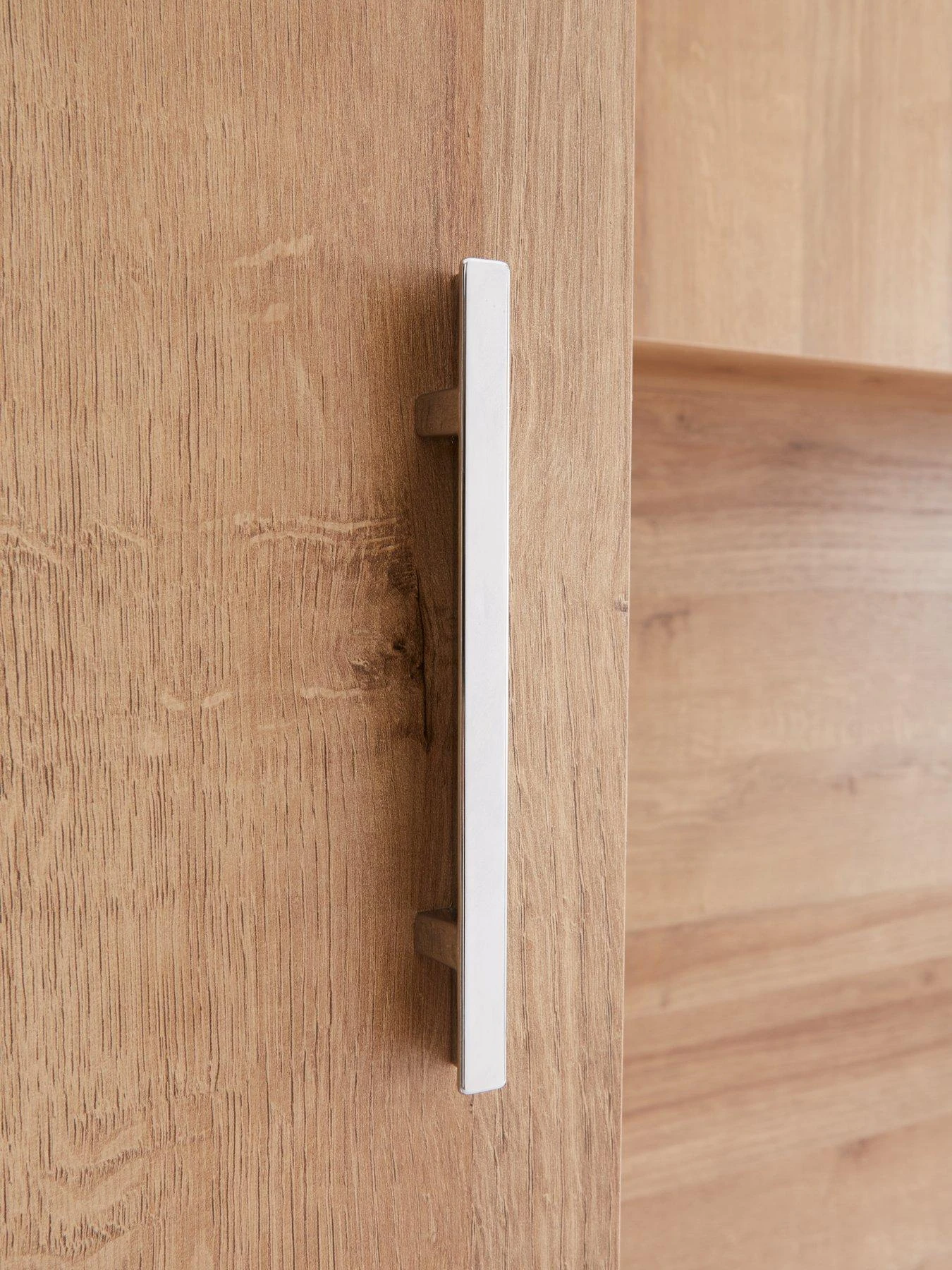 The outer doors and drawers are finished with sleek metal-look handles, while the top cupboards are handle-free for a smooth look that blends perfectly with the built-in headboard which sits smartly over your bed.