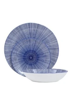 - This twelve piece dinner set combines deep blue and crisp white tones for a cool coastal look.