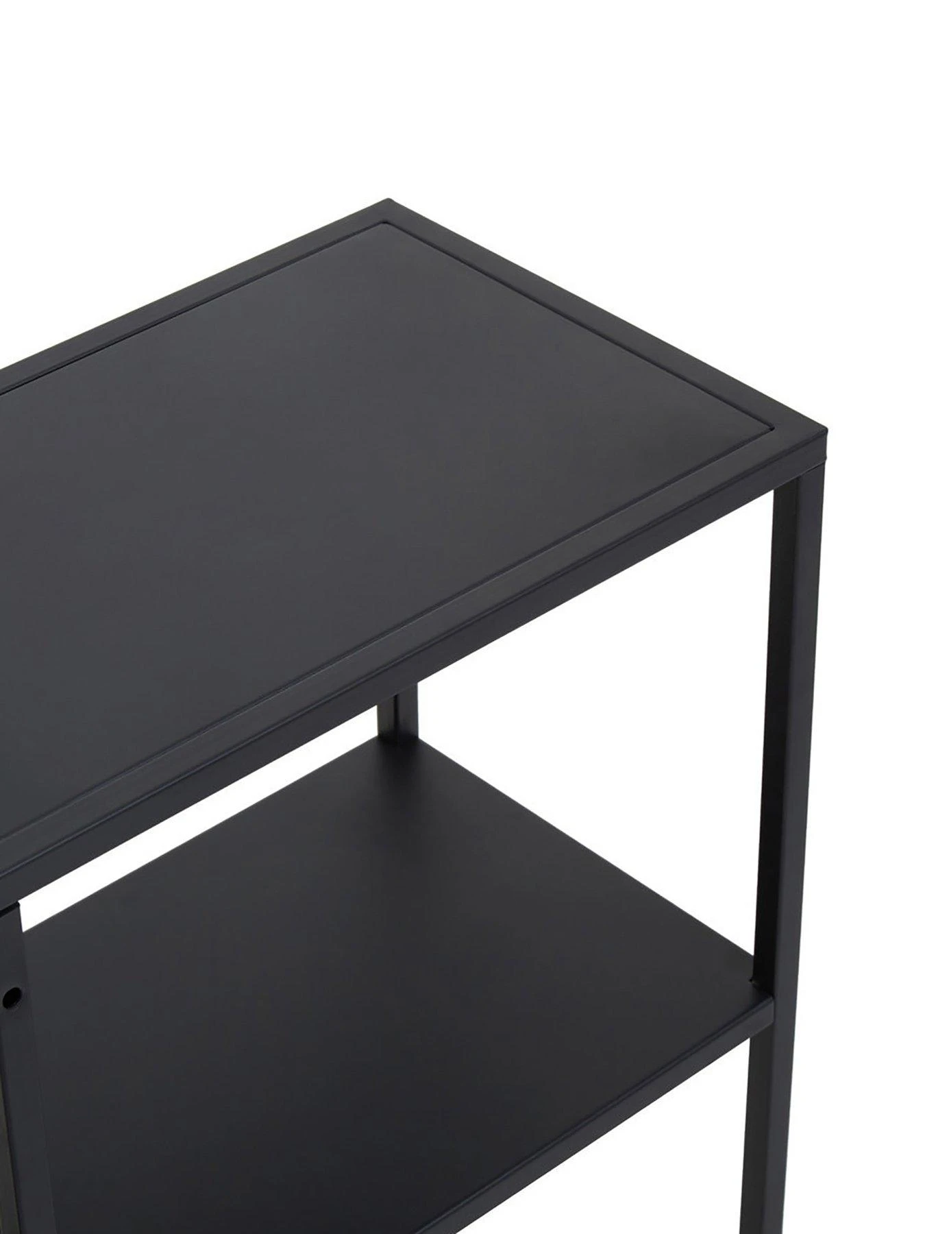 This multi shelf unit offers the versatility of putting things on display within easy reach. Made from black powder coated metal, the sturdy design has clean and minimal lines which combine to create openwork, with lower shelves adjusted at different levels.