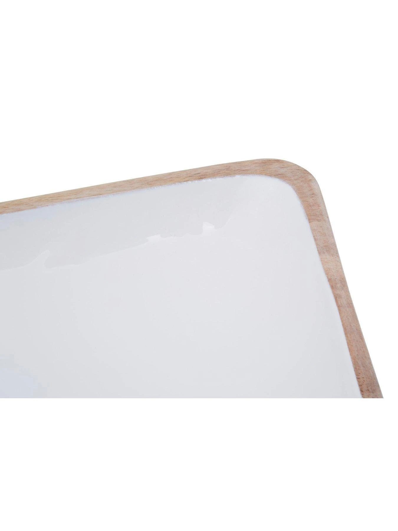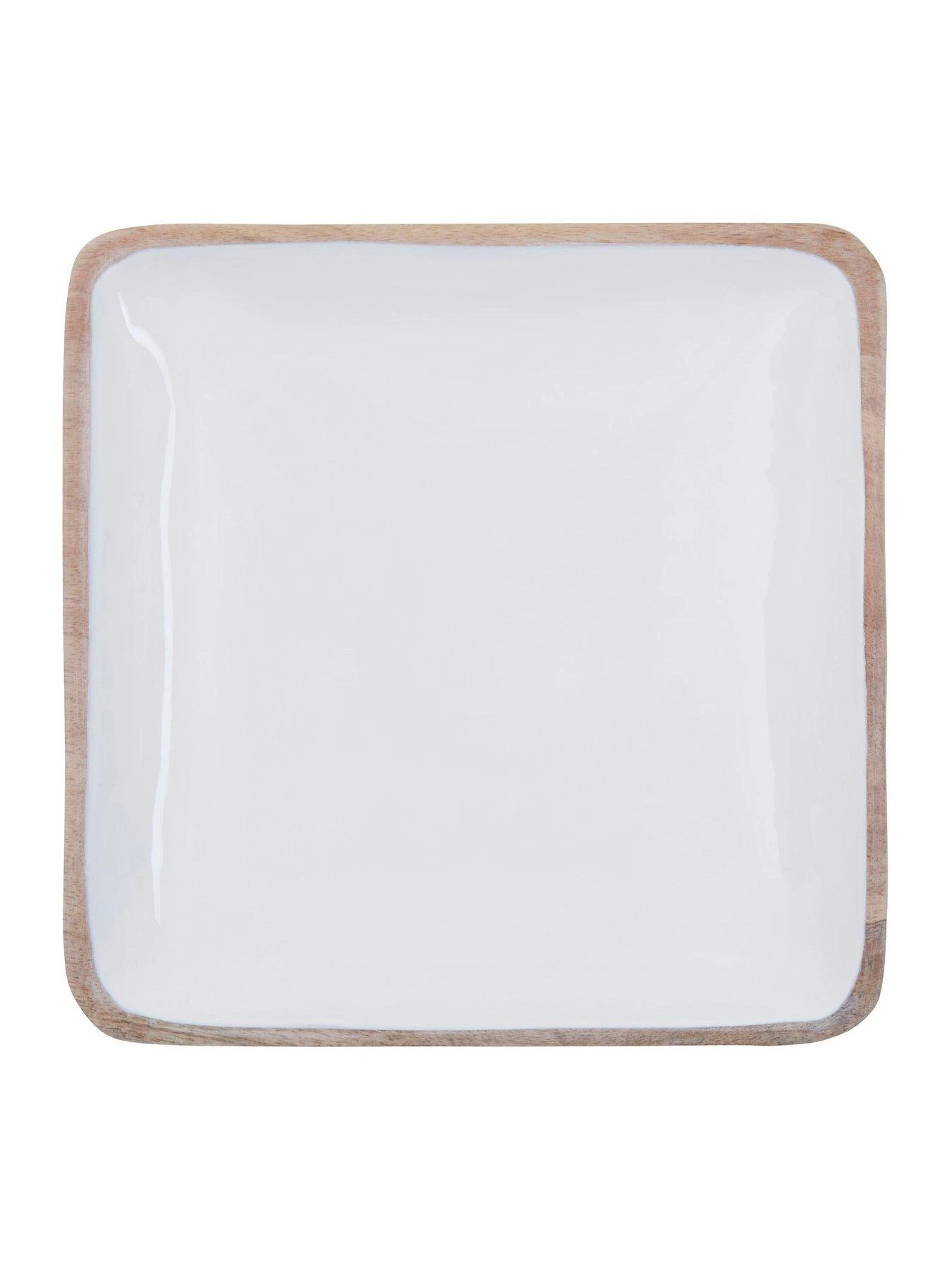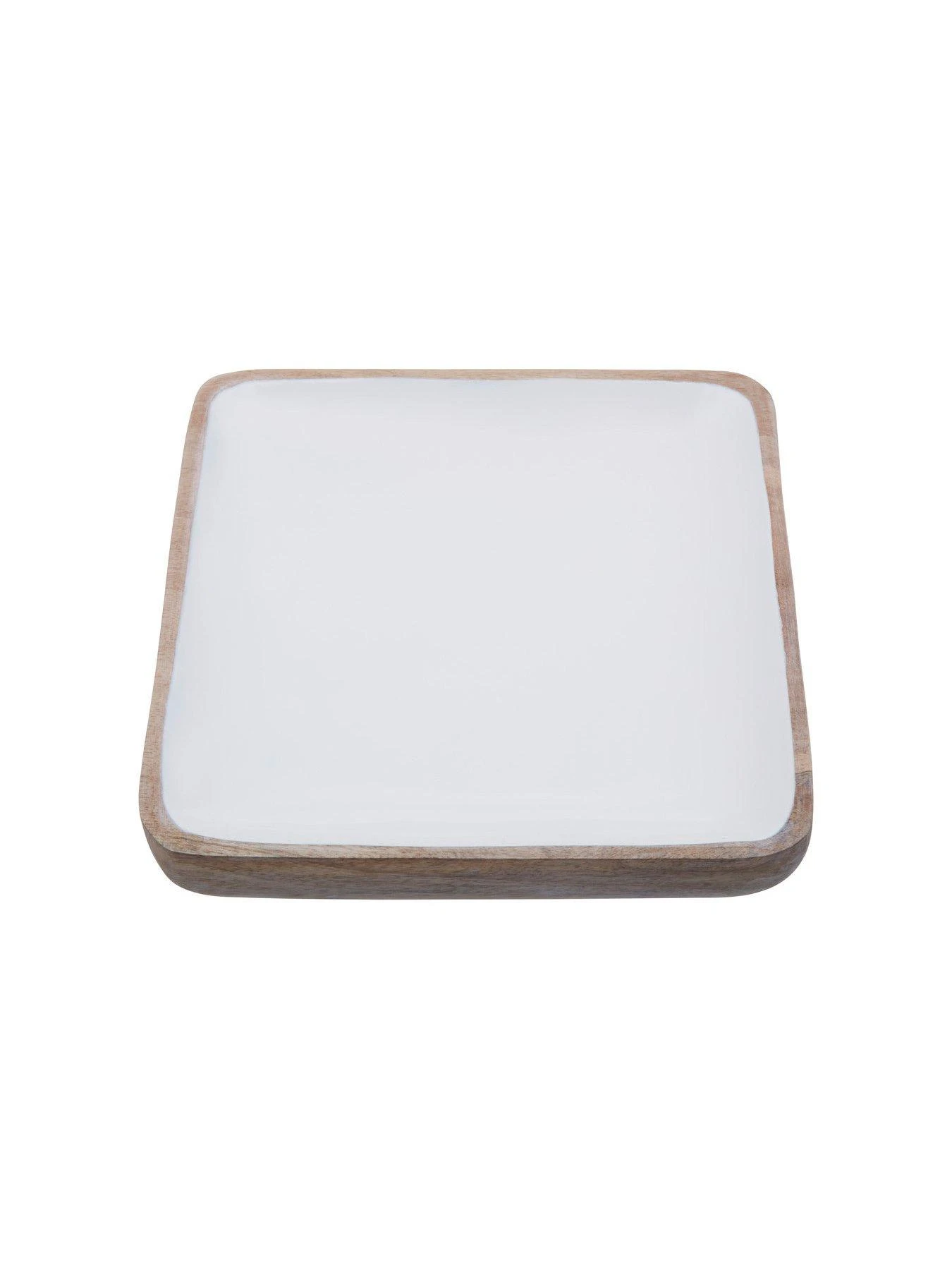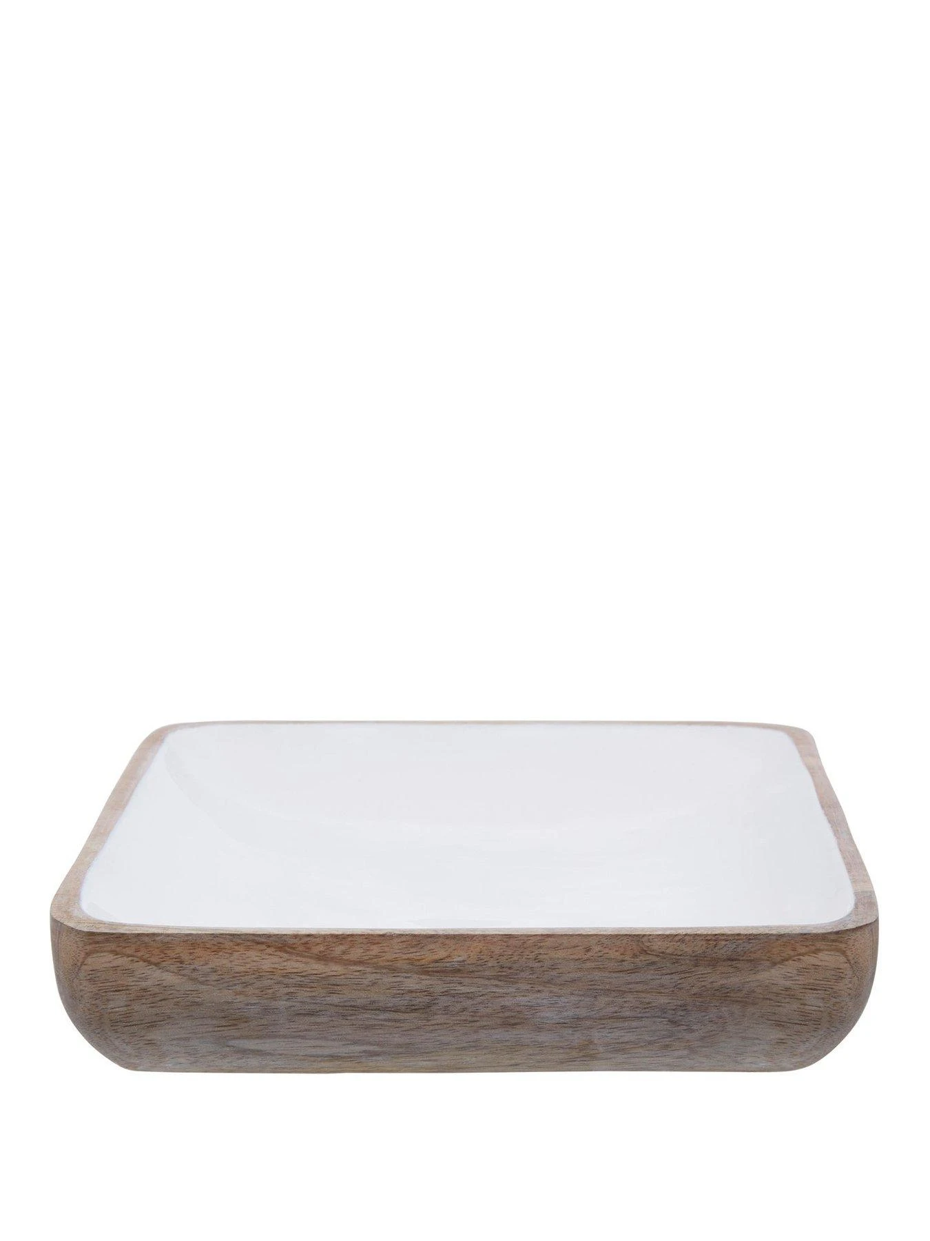 Skilfully handcrafted from mango wood, this square shaped bowl has a clean outer in natural variation and texture. The white enamel inlay lends the rustic hues a smooth appearance.