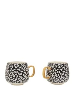 These mugs are expertly crafted from stoneware and boast a dual contrast in black and white asymmetric spotted detail. Complete with a gold finish trim around the top and an ergonomic handle, these mugs add warmth to the tabletop while serving tea or coff
