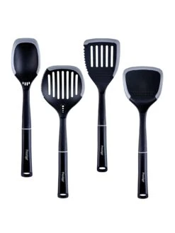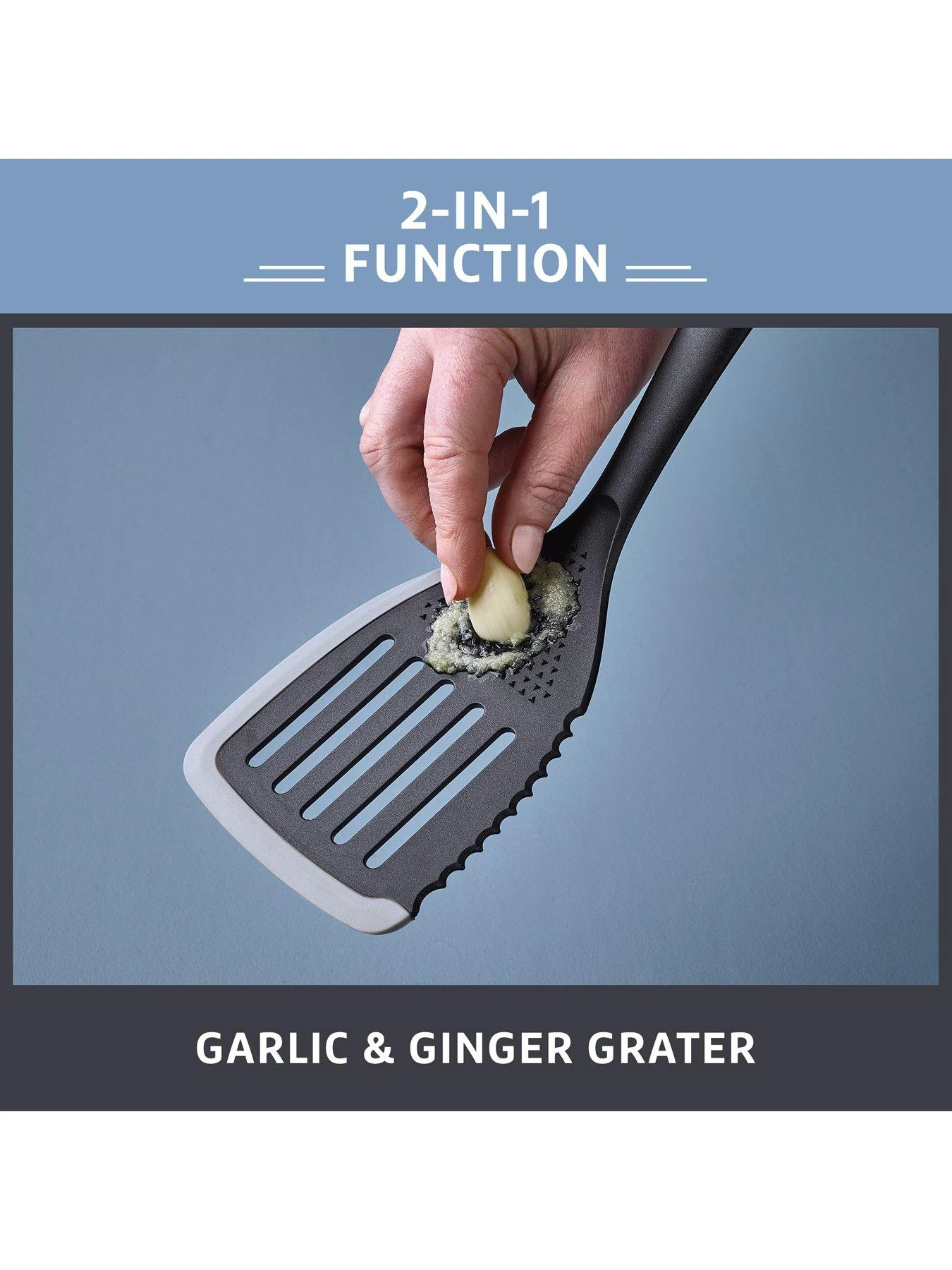 - 1 Spoon with measure guide, 1 Slotted turner with serrated edge & grater, 1 Solid turner with grater, 1 Skimmer with serrated edge & herb strip