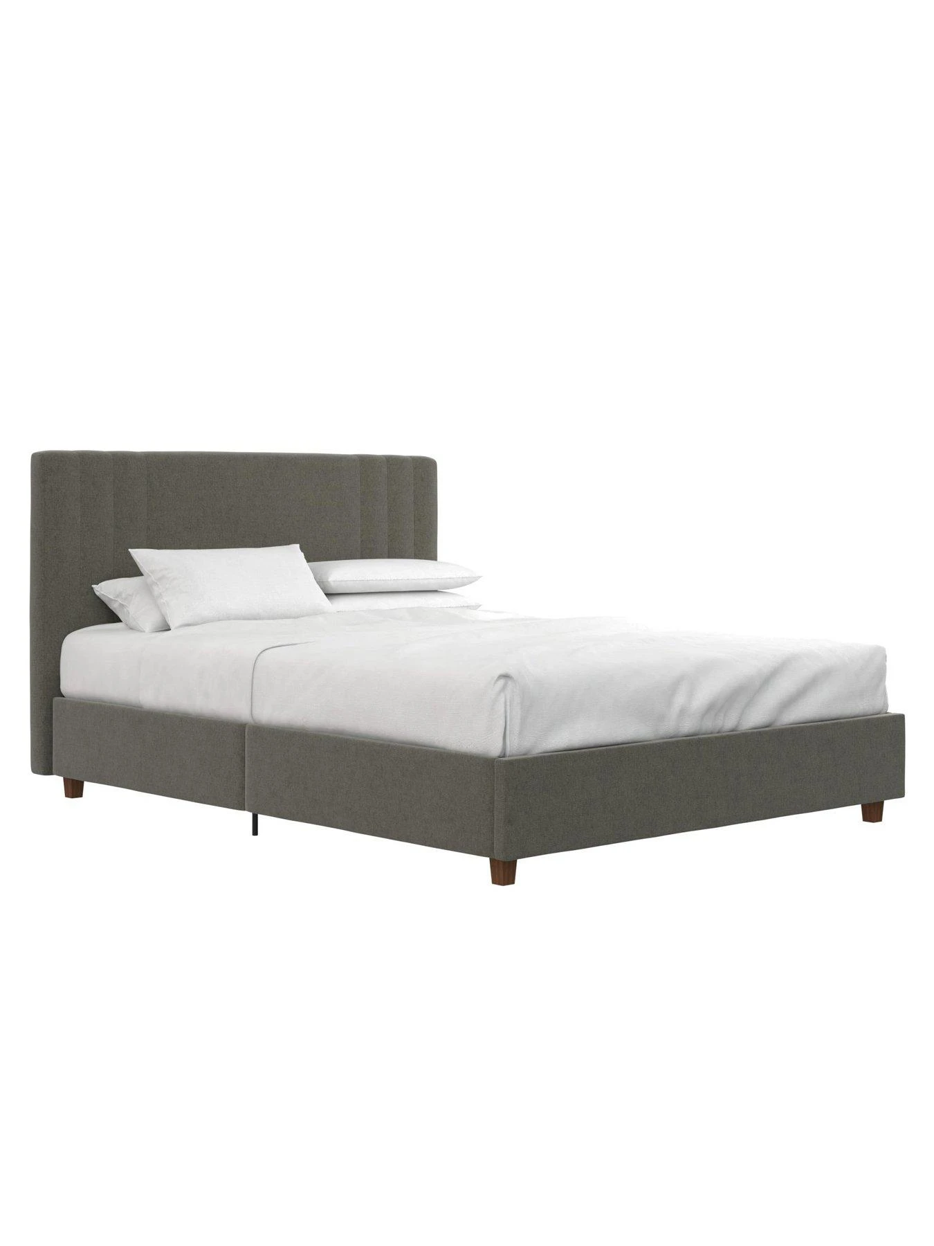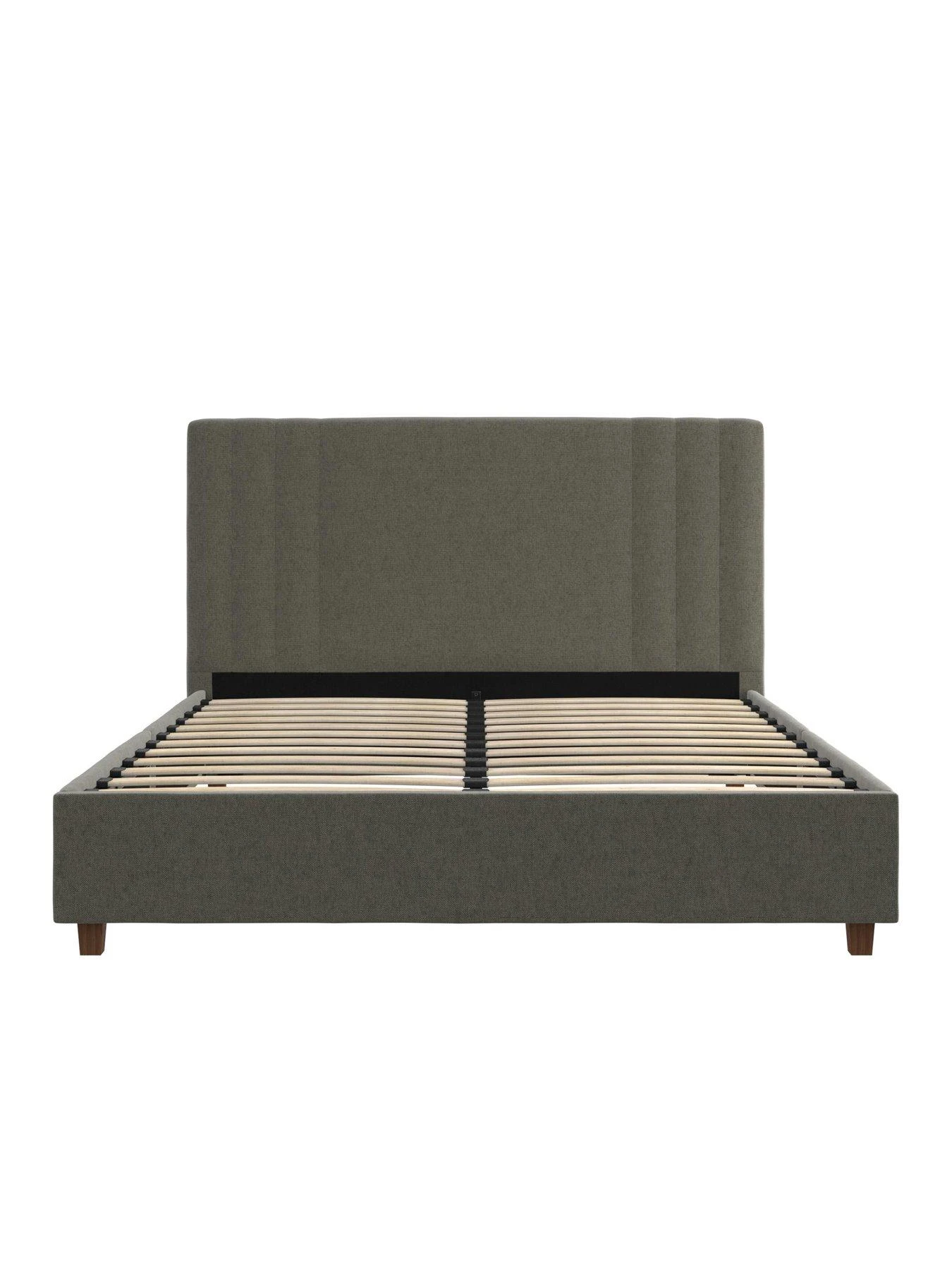 - Sturdy wood construction with soft linen upholstery and plastic legs in a wooden color finish. Mattress sold separately.