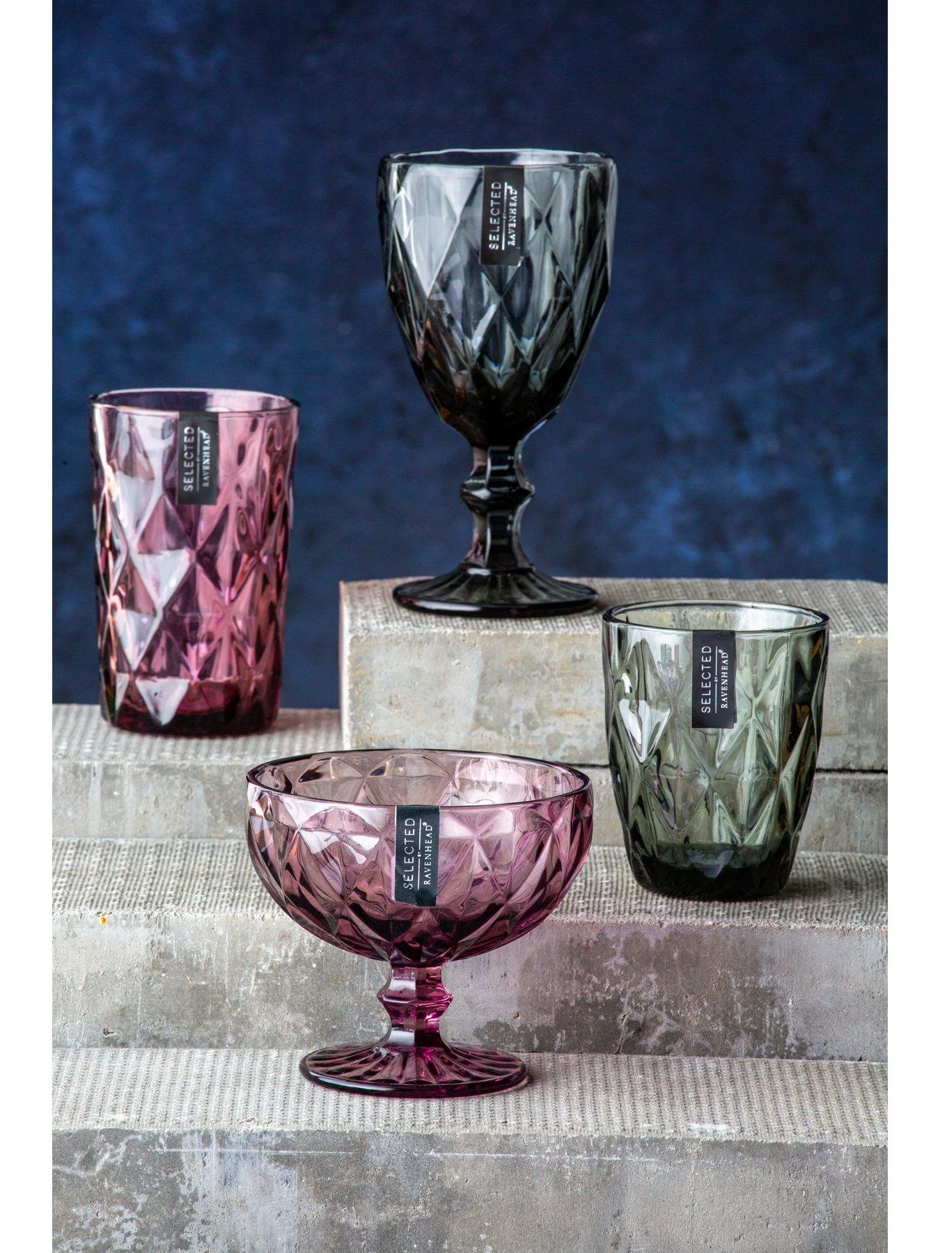 The Gemstone range features glassware with an elegant diamond design and subtle ridges in a deep charcoal grey and a mystical amethyst purple tone. The colours are inspired by semi-precious stones that are eye-catching and make for an original twist to your bar and drinkware. In our efforts to preserve the environment, each item within the range is made from at least 15% recycled glass and is dishwasher safe. From Wine glasses to footed Sundae Dishes , each glass is available individually for the perfect mix-and-match of glassware and colours.