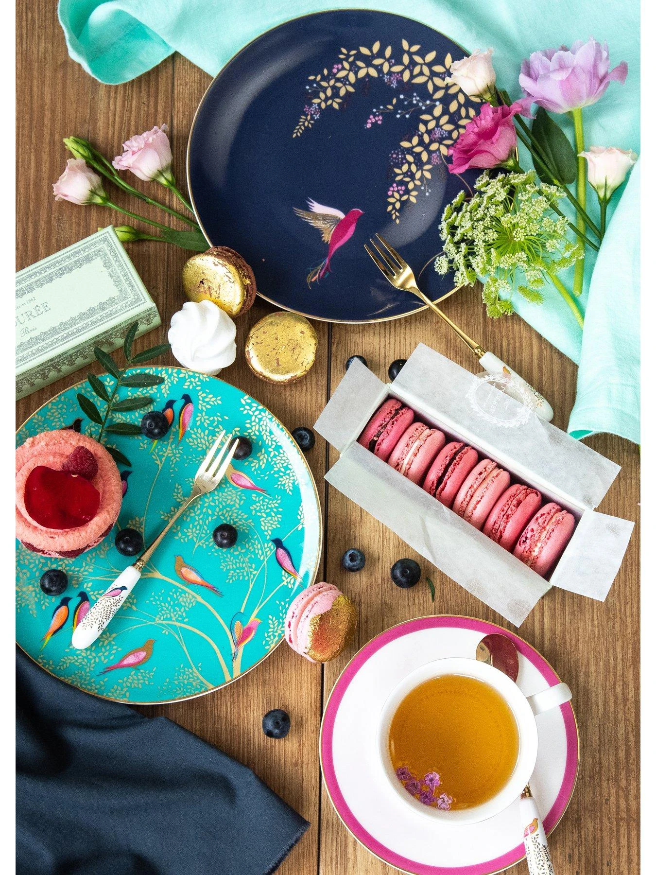 This set of four cake plates is a perfect finishing touch to an elegant afternoon tea spread. With one each in pink, navy, dark grey and green, each one is decorated with a beautiful design that sees love birds perched in lush floral trees. 22 carat gold embellishment gives them a sparkling appearance, while the bold colour schemes are full of Eastern charm.