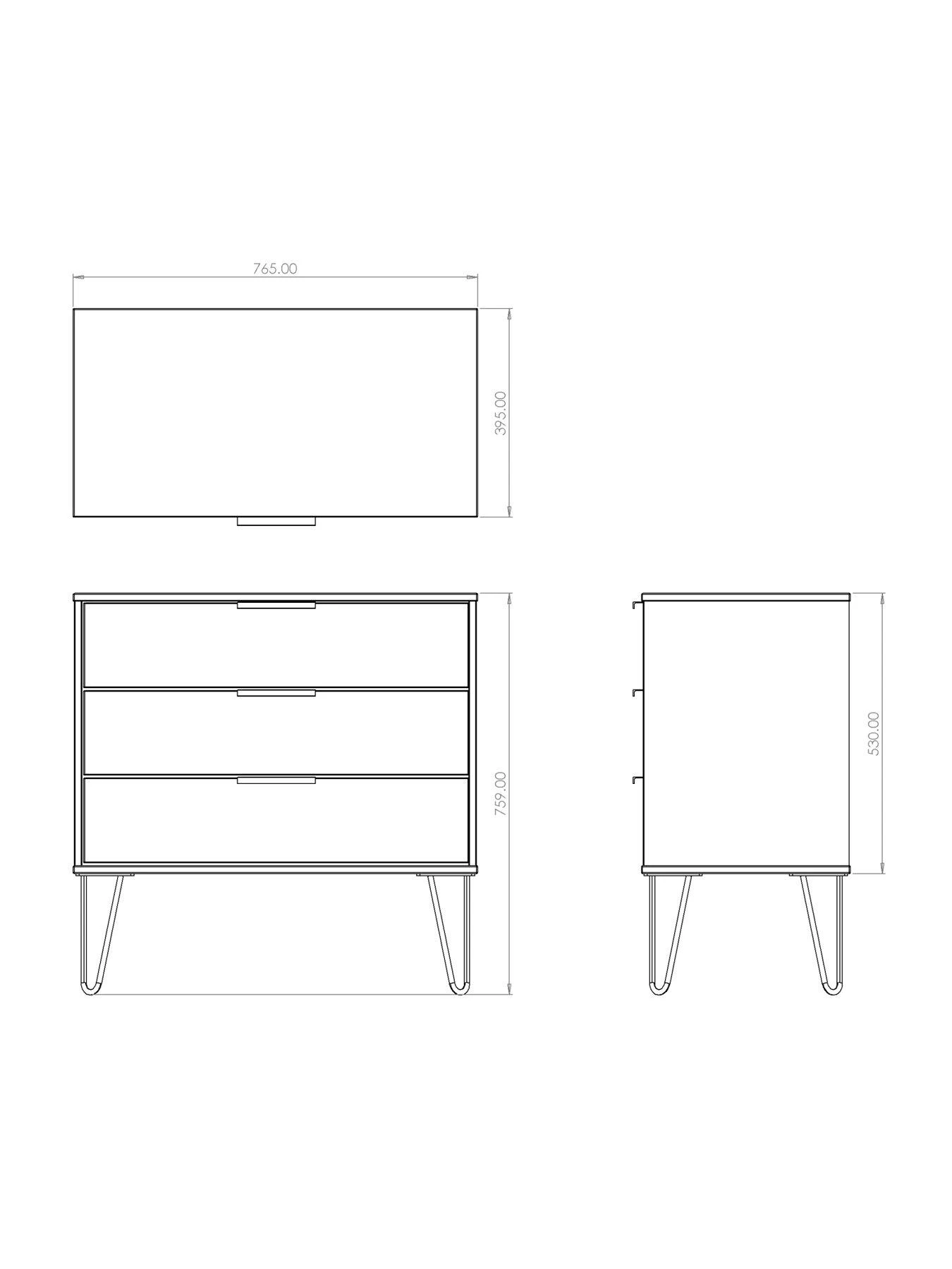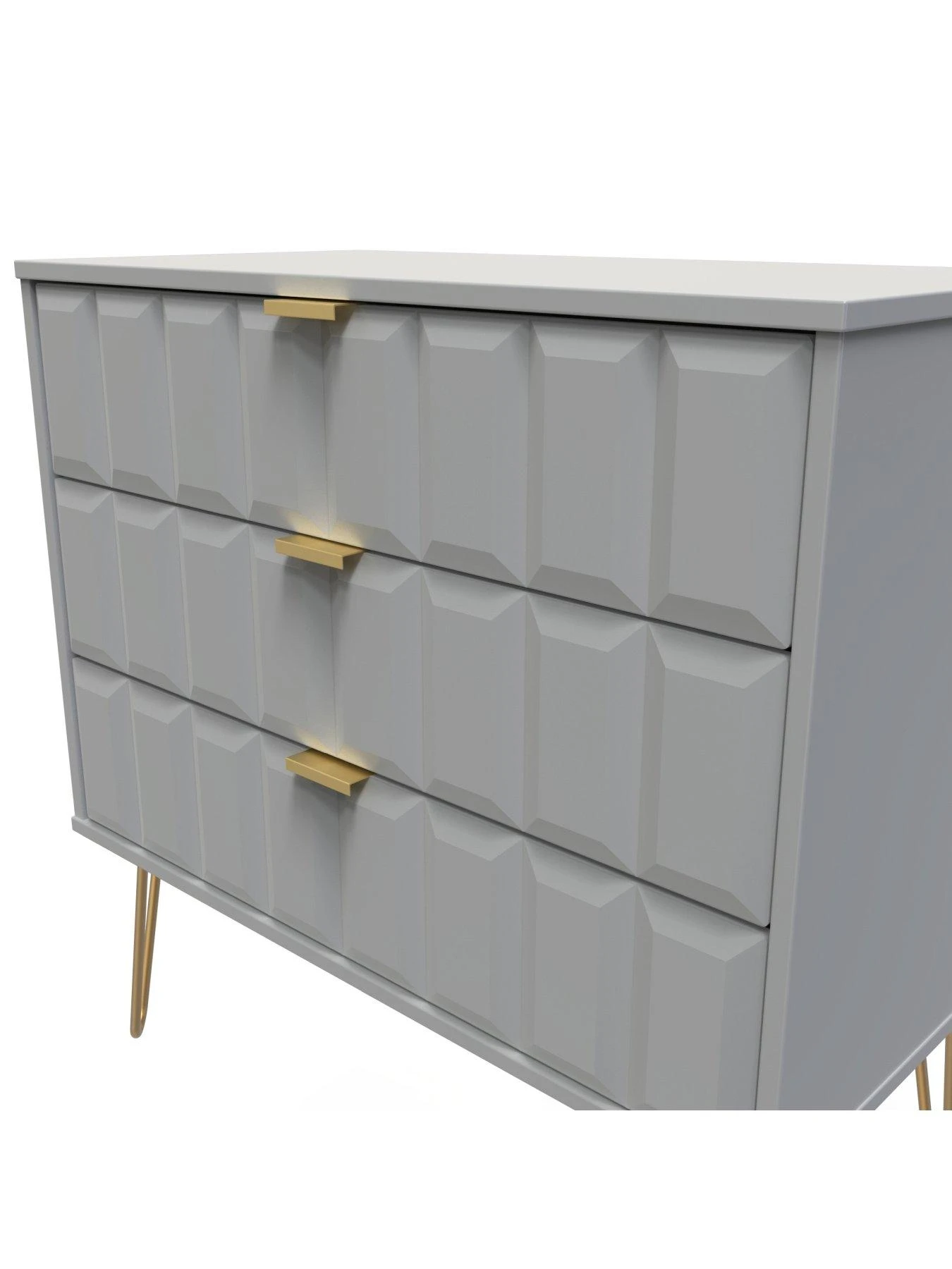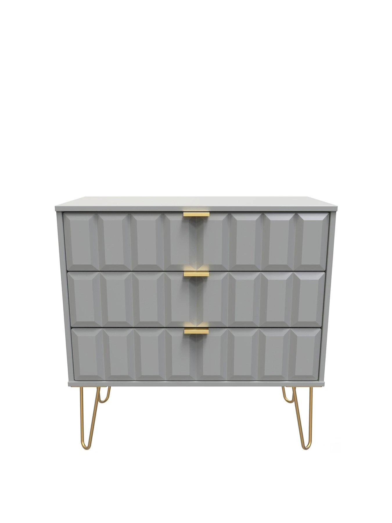 Available in a choice of black, grey or white, its scratch-resistant surface stays looking good for longer, and it’s finished with shiny gold coloured hairpin legs and matching handles. The three drawers provide lots of room for your folded fashion, and they sit on smooth easy-glide metal runners. The drawers are lined in linen-effect so they look as good on the inside as they do on the outside.