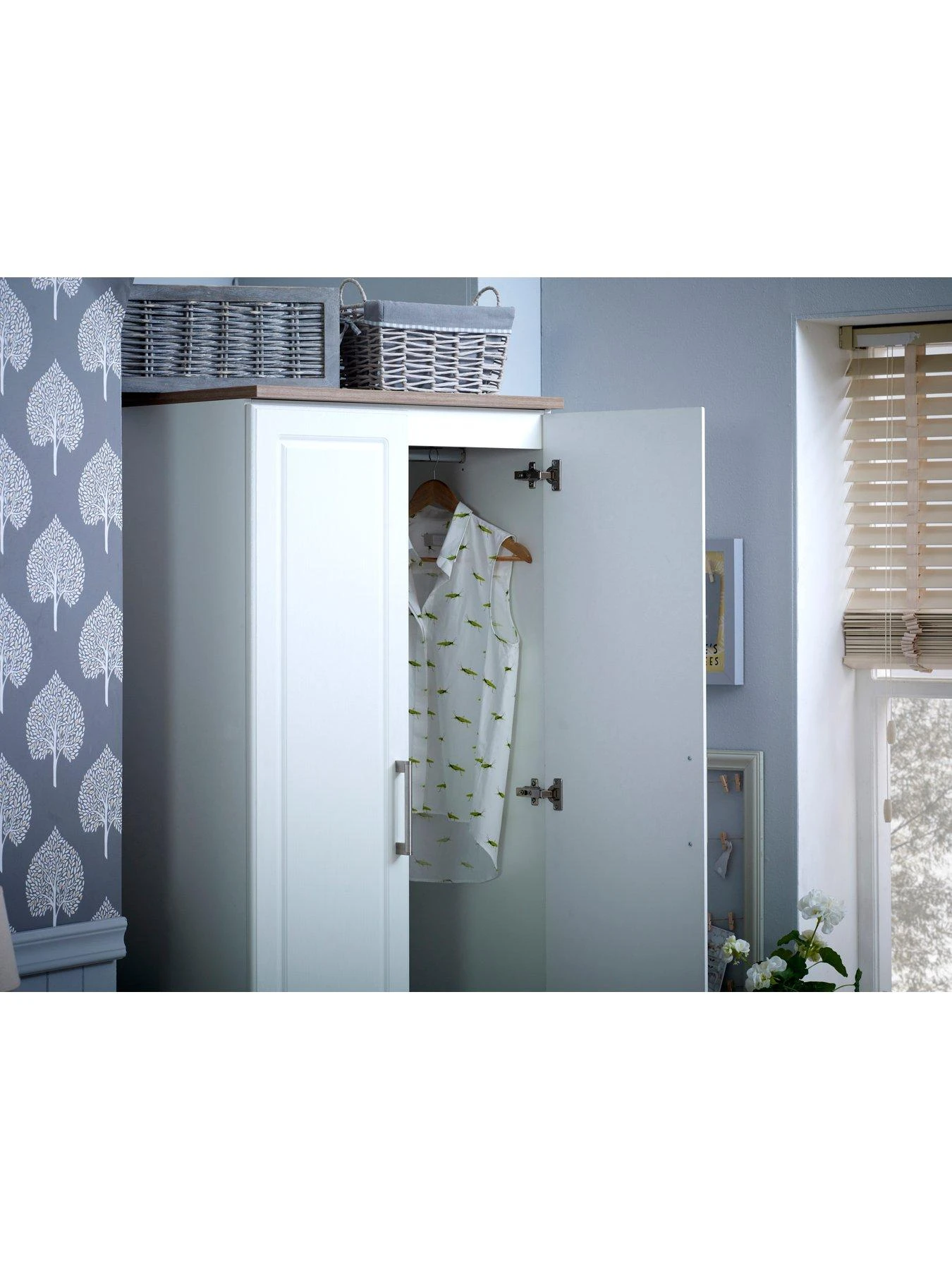 Traditionally designed with elegant panelled doors, the painted white ash finish has a subtly textured grain and contrasts smartly against the oak-effect top. Brushed metal handles add a final note of quality, and when you open up the doors you’ll find a strong metal hanging rail and storage shelf.