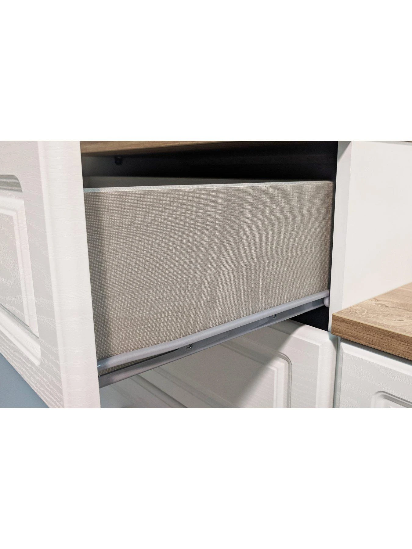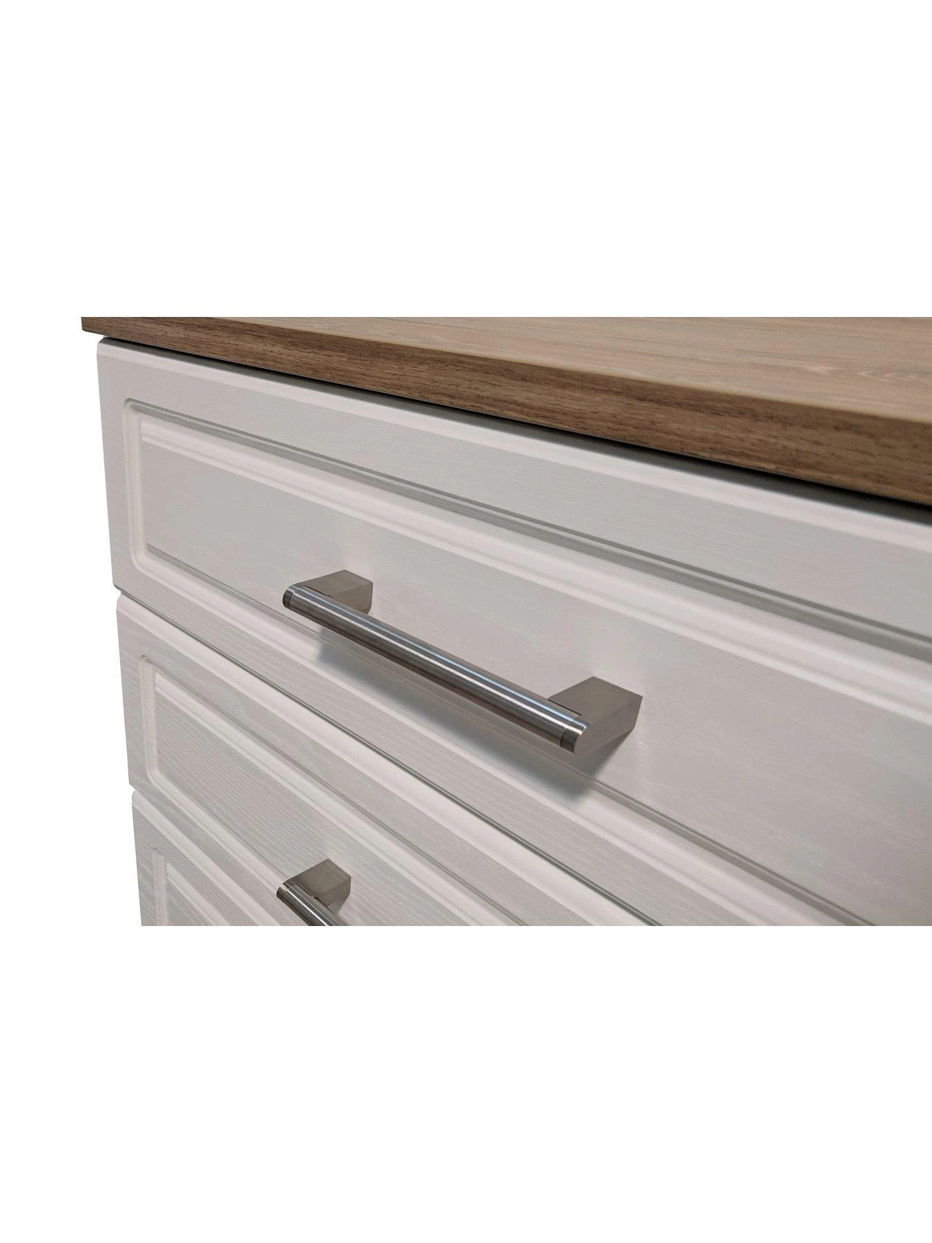 Traditionally designed with elegant panelled drawer fronts, the painted white ash finish has a subtly textured grain and contrasts smartly against the oak-effect top. Beautifully lined drawers sit on smooth metal runners, while brushed metal handles add a final note of quality.