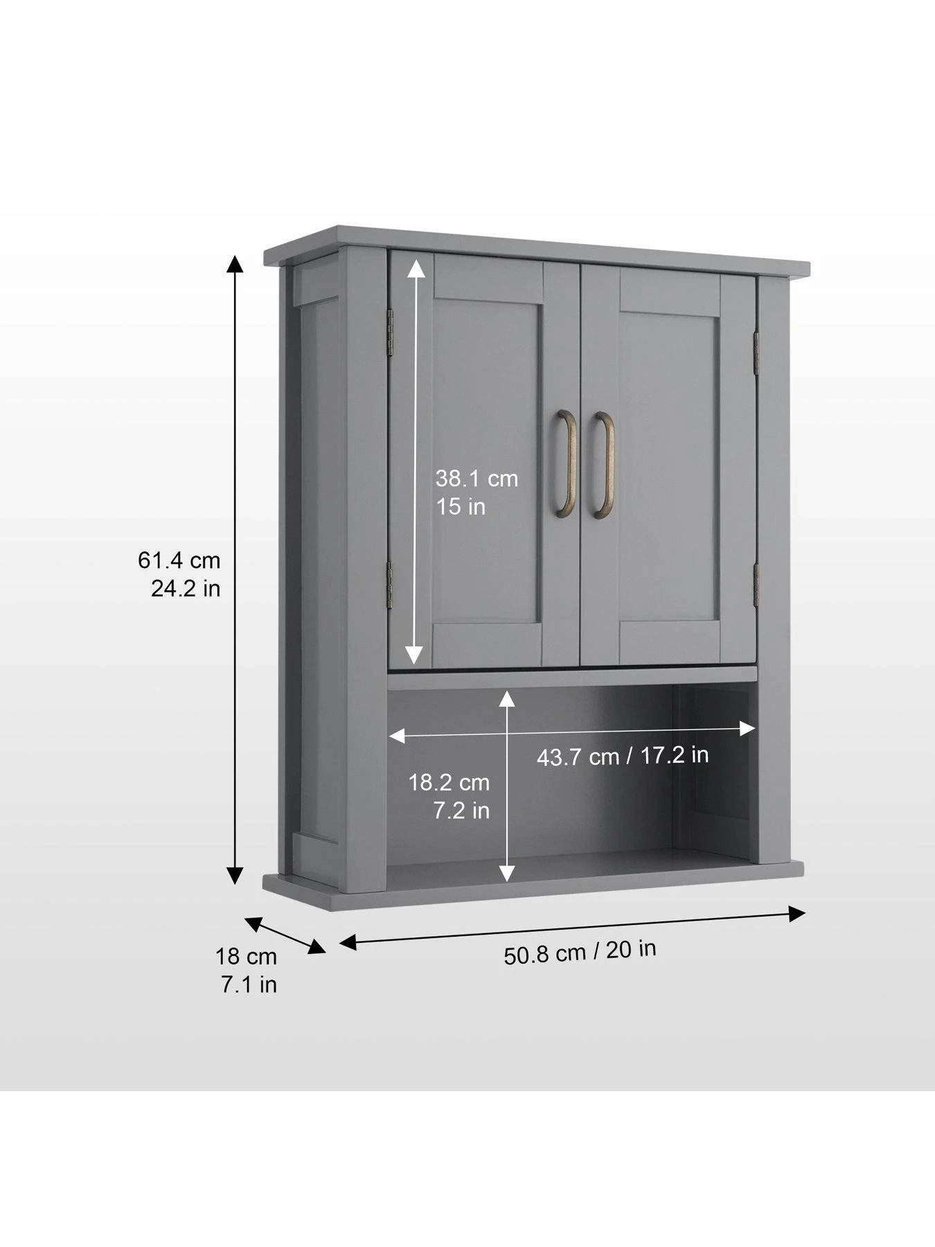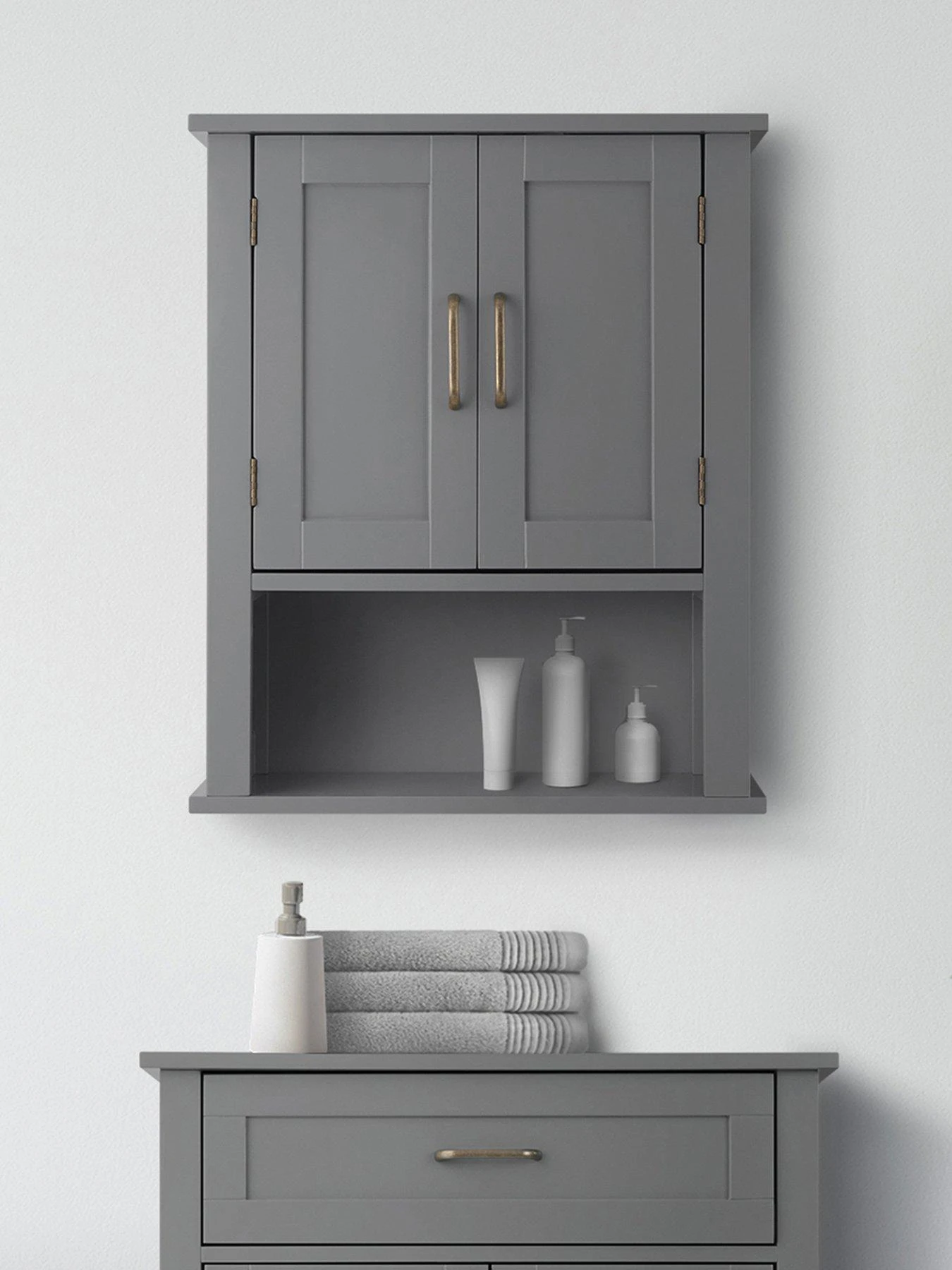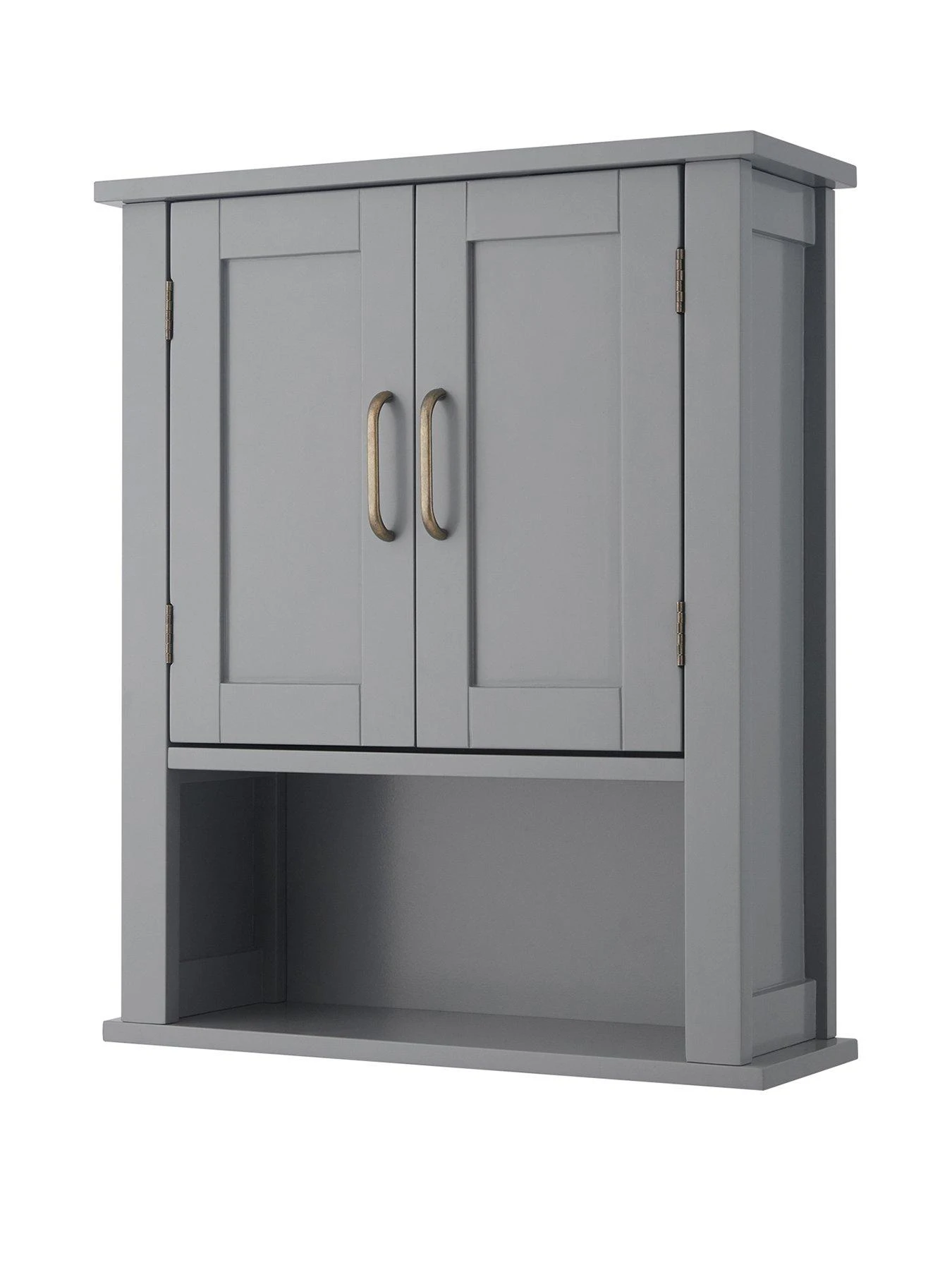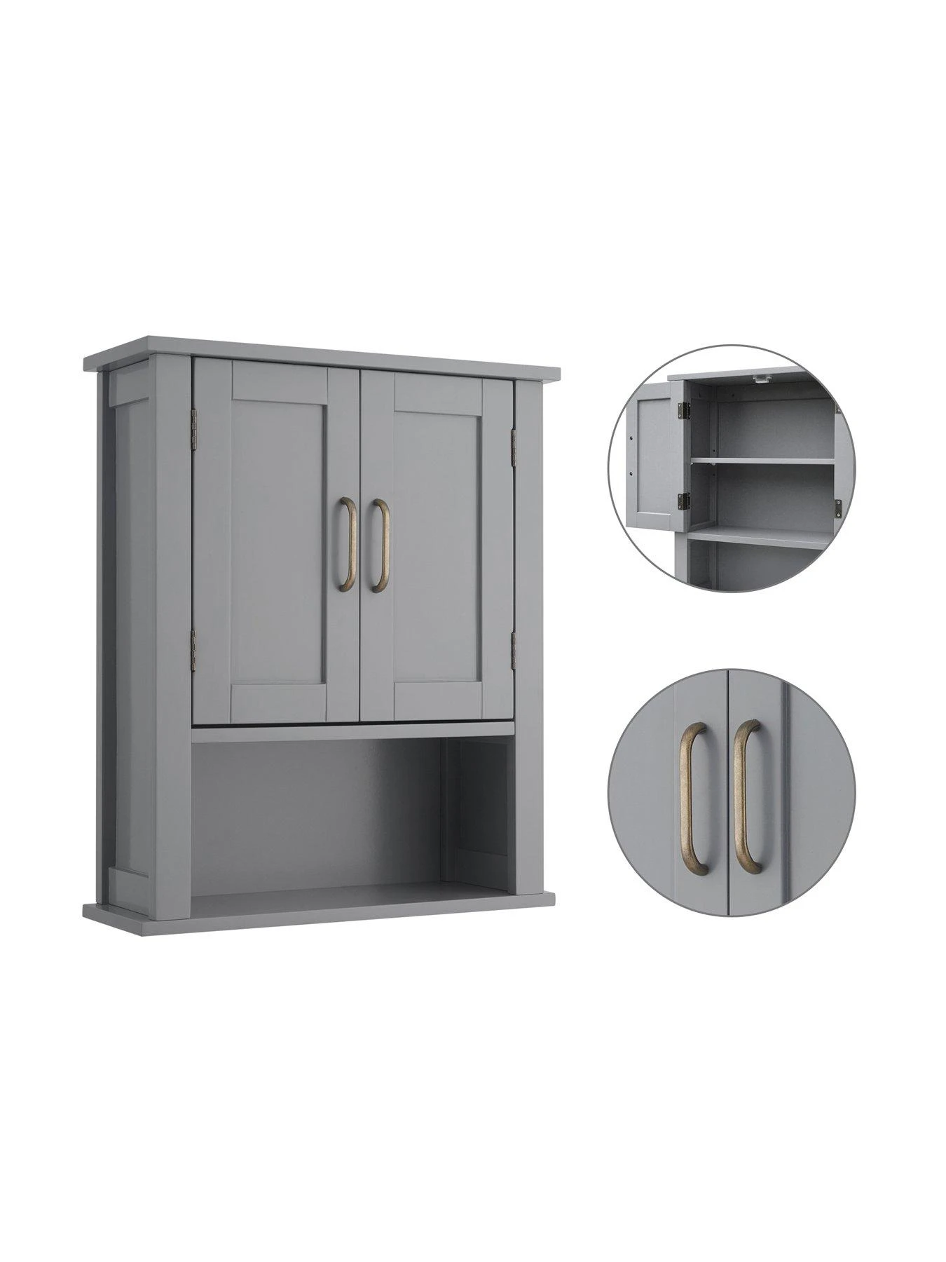 The Mercer Wall-Mount Medicine Cabinet features a versatile design and grey finish with double doors and brass handles for an elevated and stylish addition to your bathroom space. The interior adjustable shelf and bottom open shelf help to reduce clutter and keep your bathroom tidy. Constructed from durable engineered wood, this bathroom wall cabinet unit is built to provide you with long-lasting organisation. Easy, step-by-step instructions and all of the hardware needed for installation are included for quick assembly.