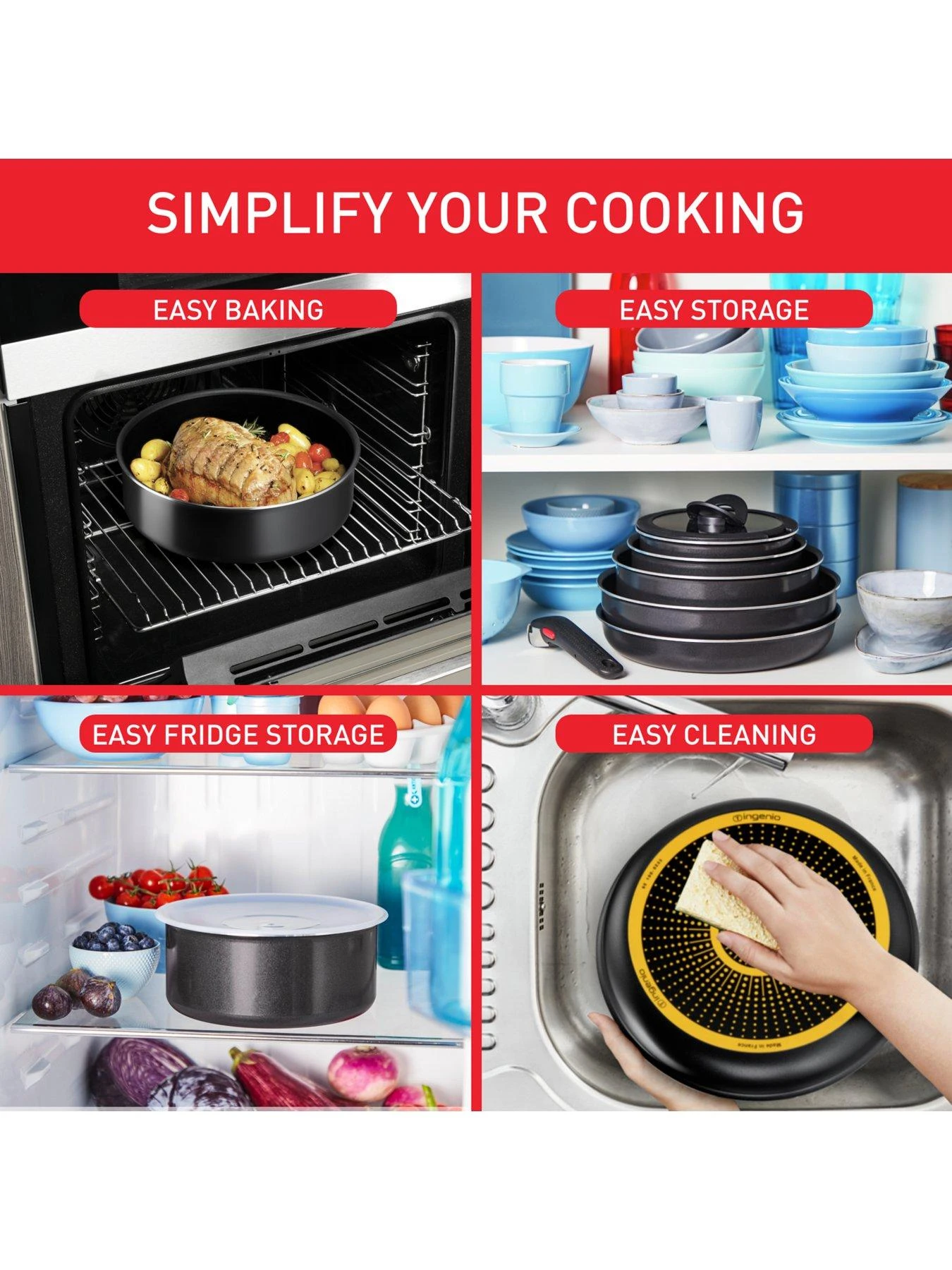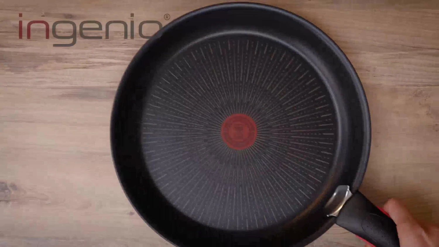 Ingenio is a total game-changer in the kitchen. Minus the handle, these pans stack inside each other, giving you up to 50% more space in your cupboards*. 100% safe, the handle has a three-point system to keep it secure. It’s reinforced to carry up to 10kg** and guaranteed for 10 years***. Plus, it’s a bit of a magician in the kitchen, turning frying pans into oven dishes, and saucepans into bakeware. Start cooking on the hob then move the pan into the oven. Unclip the handle and voila: the pan is a baking tin. The pots also make stylish serving dishes; just use the handle to go from oven to table. Leftovers? Attach the airtight lid and put the pot in the fridge****! Designed for ease, Ingenio Easy Cook & Clean has our 100% toxin-free****** Titanium non-stick coating inside and out which makes clean-up a breeze. Or pop it in the dishwasher******* (because who has time to wash up?). Thermo-Signal technology makes cooking easy. When the hourglass disappears, the pan is at the ideal temperature for perfect searing. And the diffusion base ensures uniform heat distribution on all hobs (except induction), for even cooking.