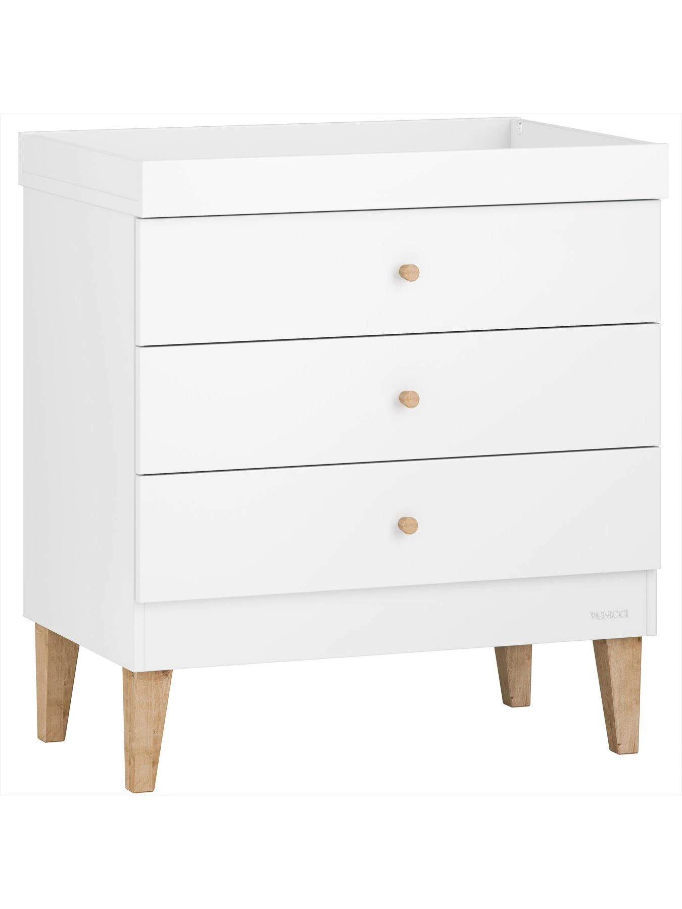 The Saluzzo Chest Changer comes with 3 quietly closing drawers with contrasting wooden handles made of varnished oak, that perfectly match the furniture legs. The chest also includes a removable top changer, which provides an ample area for nappy changes and daily baby care.