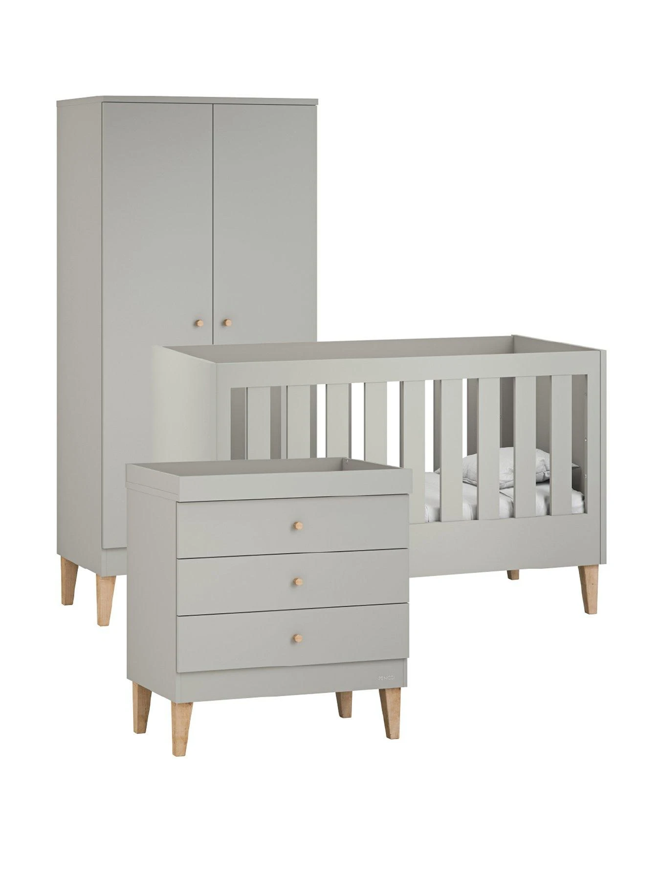 The Venicci Saluzzo Nursery collection is inspired by modern Scandinavian design, focusing on simplicity and elegance. This simple yet stylish furniture set combines calming colour with contrasting wooden legs made of durable varnished oak.