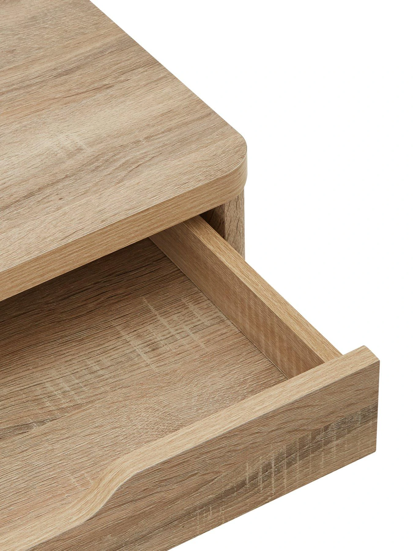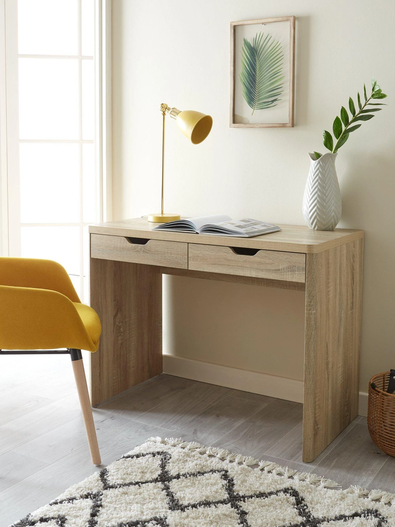 The realistic oak-effect finish will match a wide range of colour schemes, while two drawers are a handy hideaway for stationery, files and more. The drawers glide open on smooth metal runners, even full.