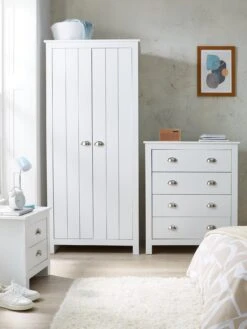 In a neutral white shade that brightens their space and goes with a whole host of decors, it includes a 2 door wardrobe containing a hanging rail. The doors have a tongue-and-groove style finish for added interest, while adjustable hinges allow for easy alignment on uneven floors.