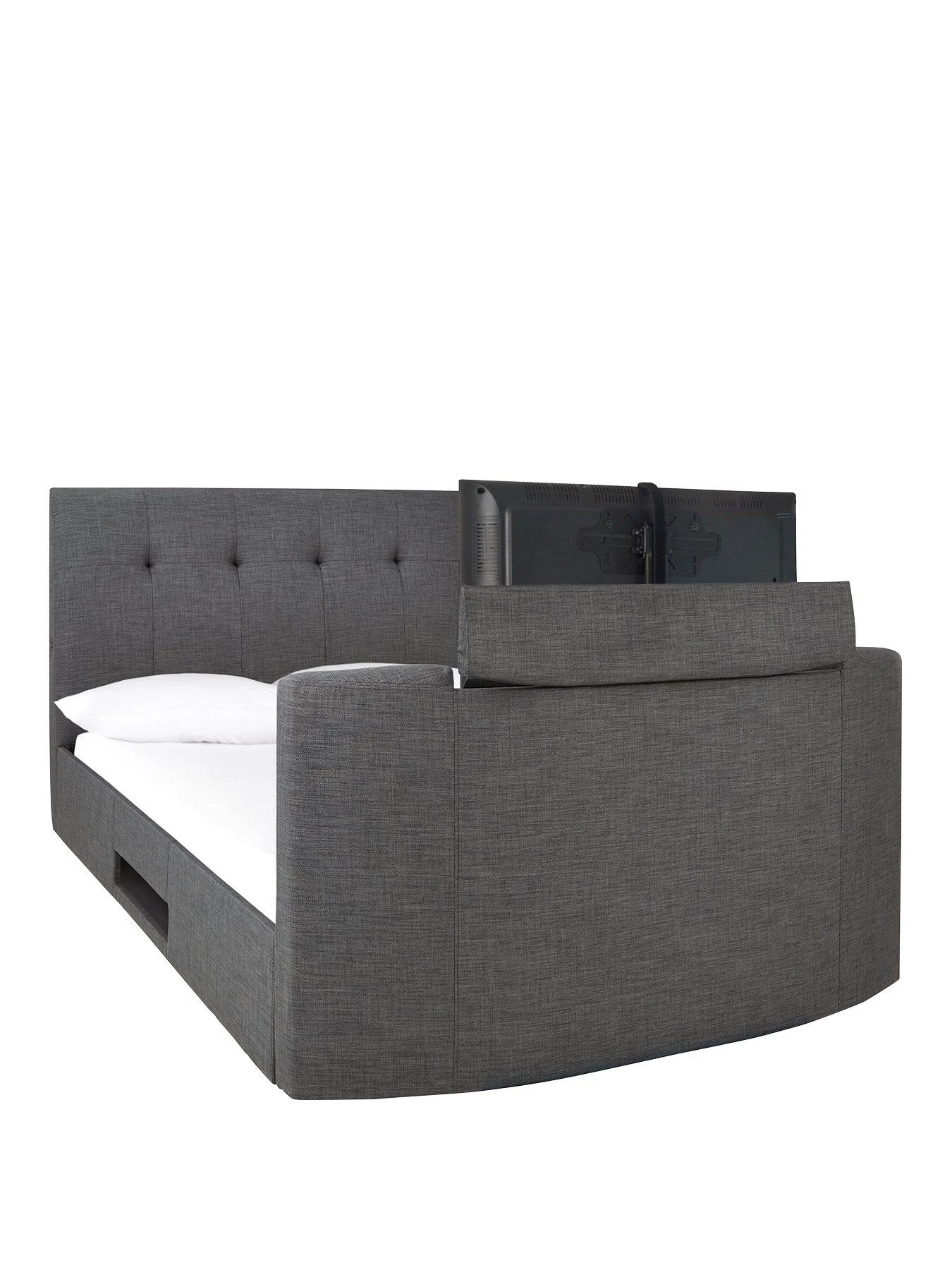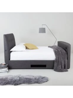 Upholstered in a wonderfully textured fabric, the foot end has space for a flatscreen TV up to 42 inches in screen size. The manual TV lift mechanism allows you to easily raise the TV into view and push it back down when you’ve finished, keeping it neatly out of sight.