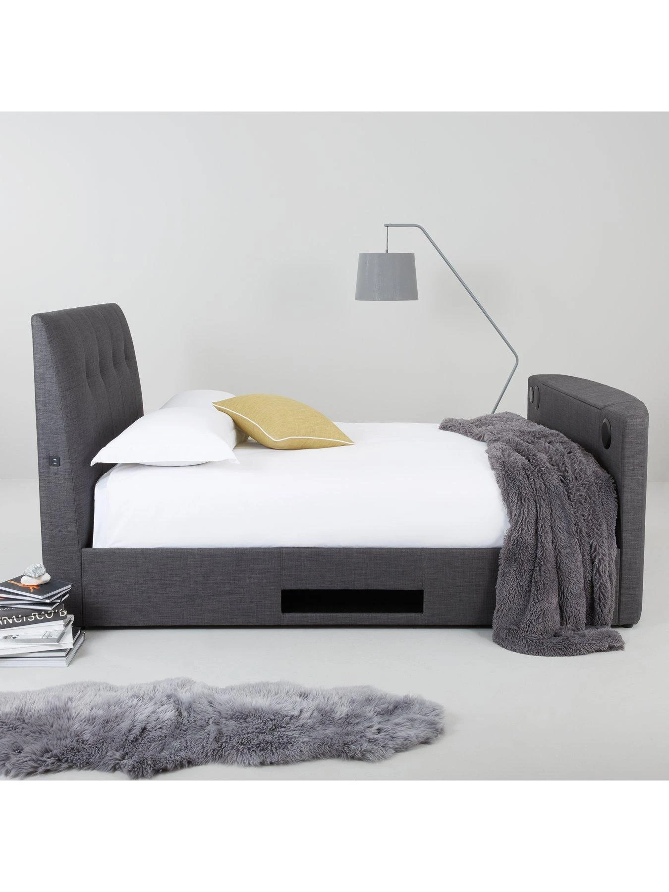 The base features an area for your set-top box, DVD player or games console, and the mattress can be manually side lifted with the help of the hydraulic arms to reveal a spacious storage area for everything from spare bedding to DVDs!