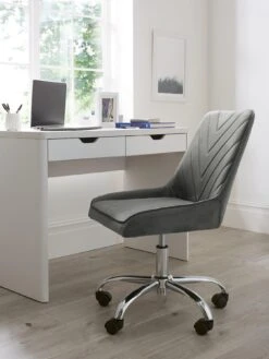 This stylish office chair will add style and comfort to your working from home days. Wrapped in a super soft fabric that comes in a contemporary shade, the back is highlighted by chevron detail, while the angled sides of the seat keep you comfortably positioned. Sitting on a chrome base with castors for easy movement, it’s height adjustable.