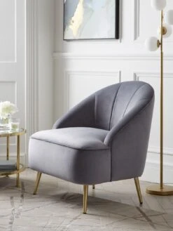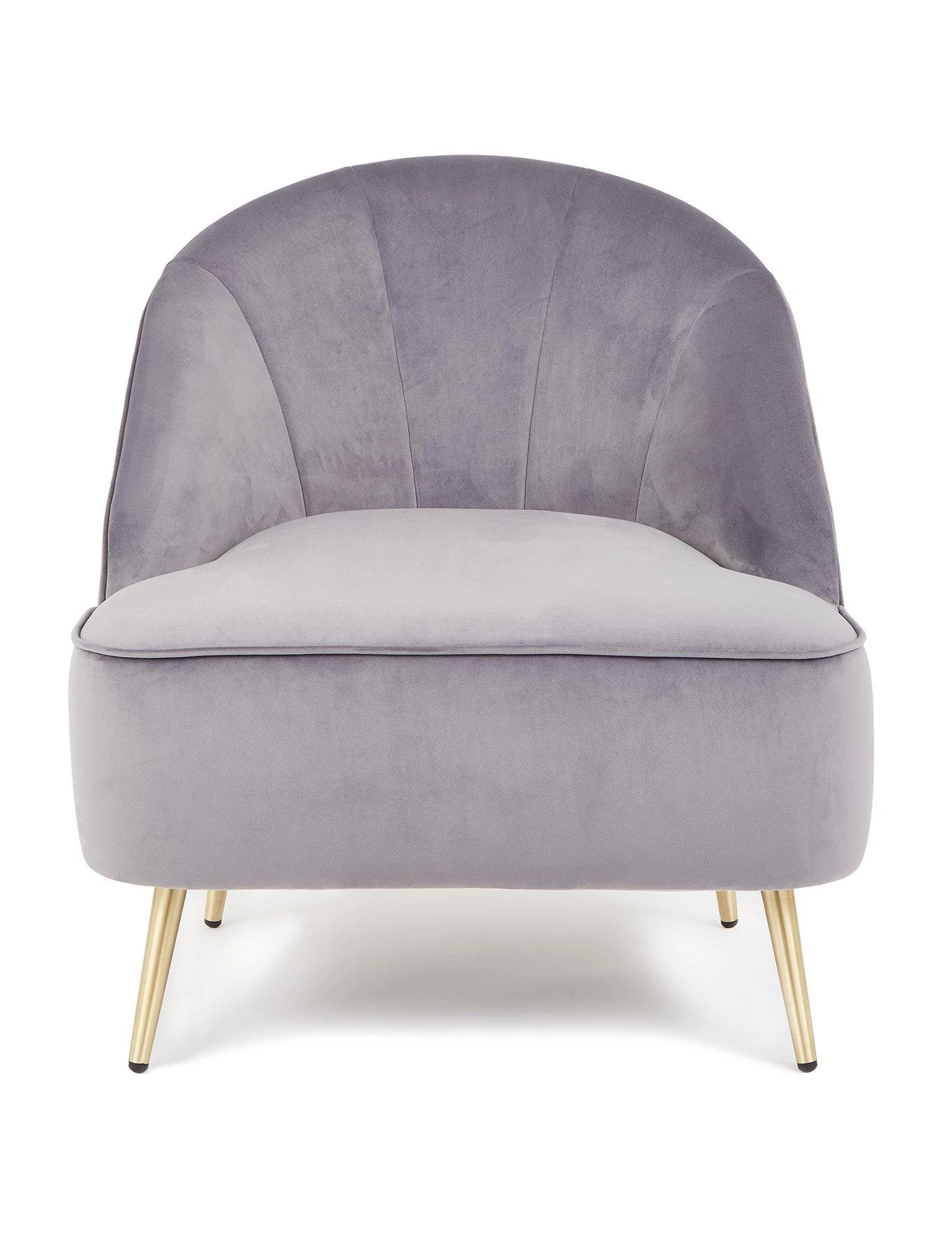 Designed with a deep pocket sprung cushion, curvy oyster shell-inspired back rest, it’s been upholstered in a texturally tempting go-with-everything grey fabric and sits on Scandi-style gold coloured metal legs.