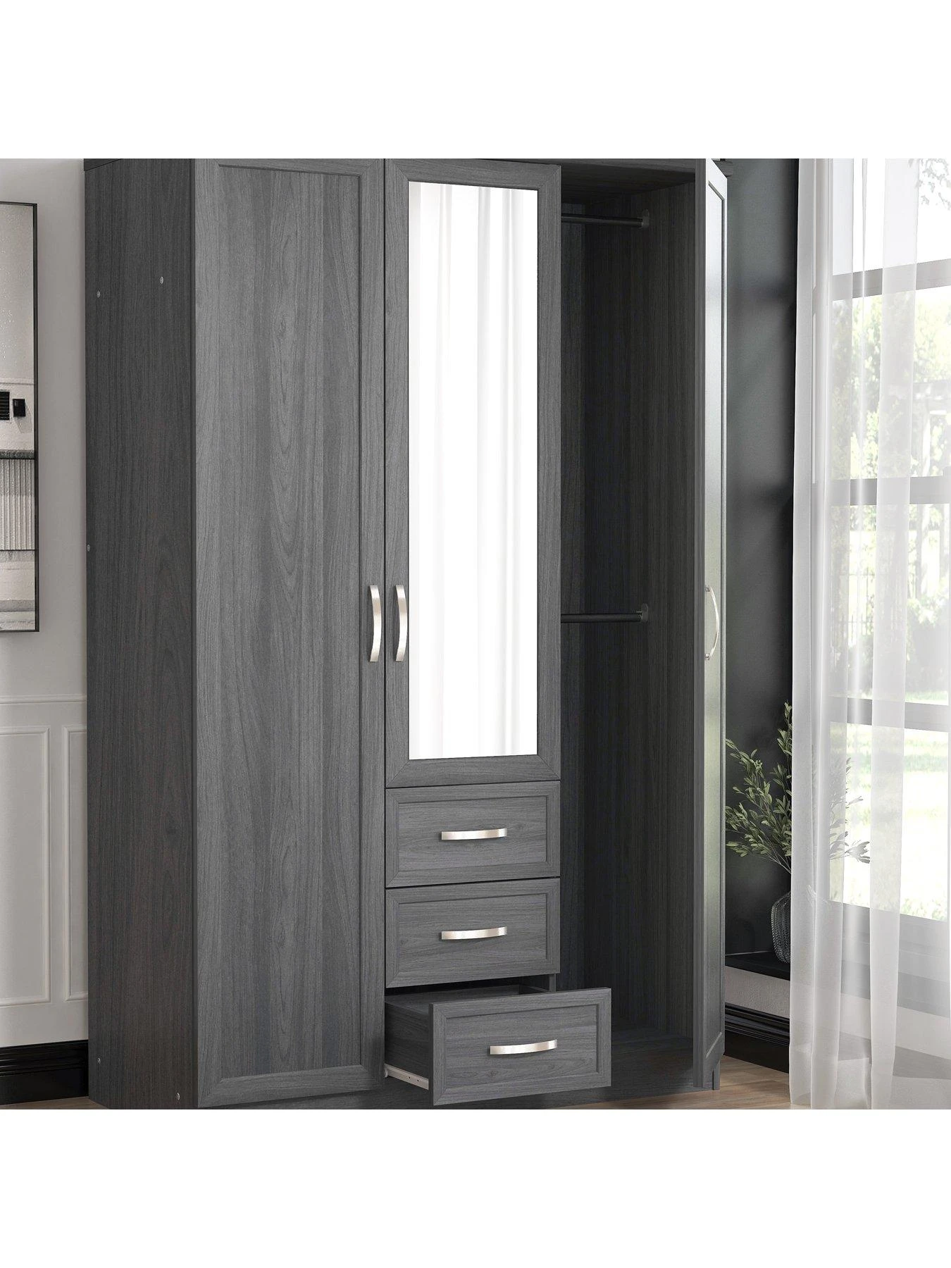A mirrored centre door adds light and depth to your space, while one side contains a hanging rail and high shelf, while the opposite section features a further two rails (one on top of the other), which are perfect for shorter items like blouses.