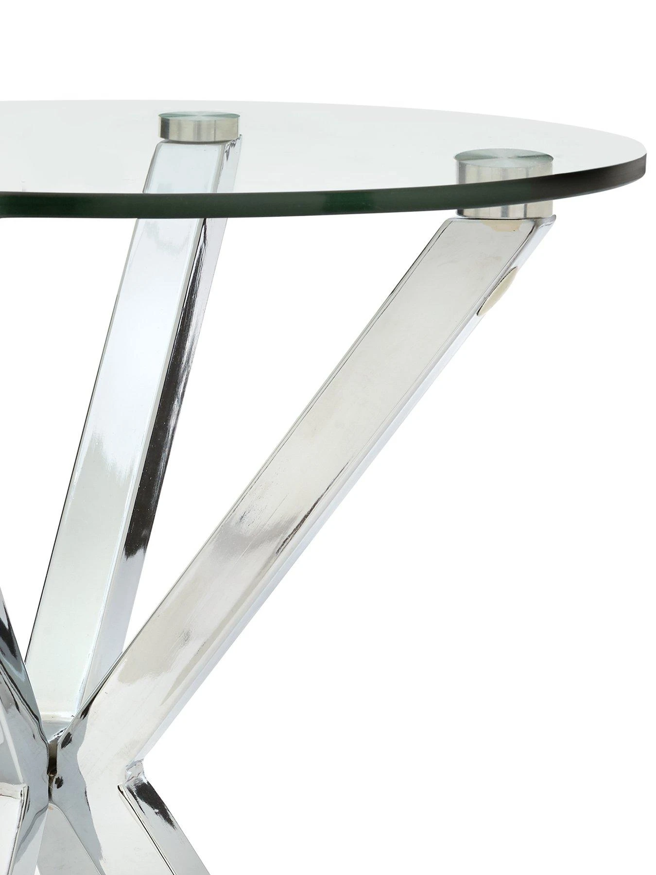 Four cool coloured ‘chopstick’ legs come together at their centre points, creating a striking base, and their sleek shine matched by is a smooth circular glass table top.