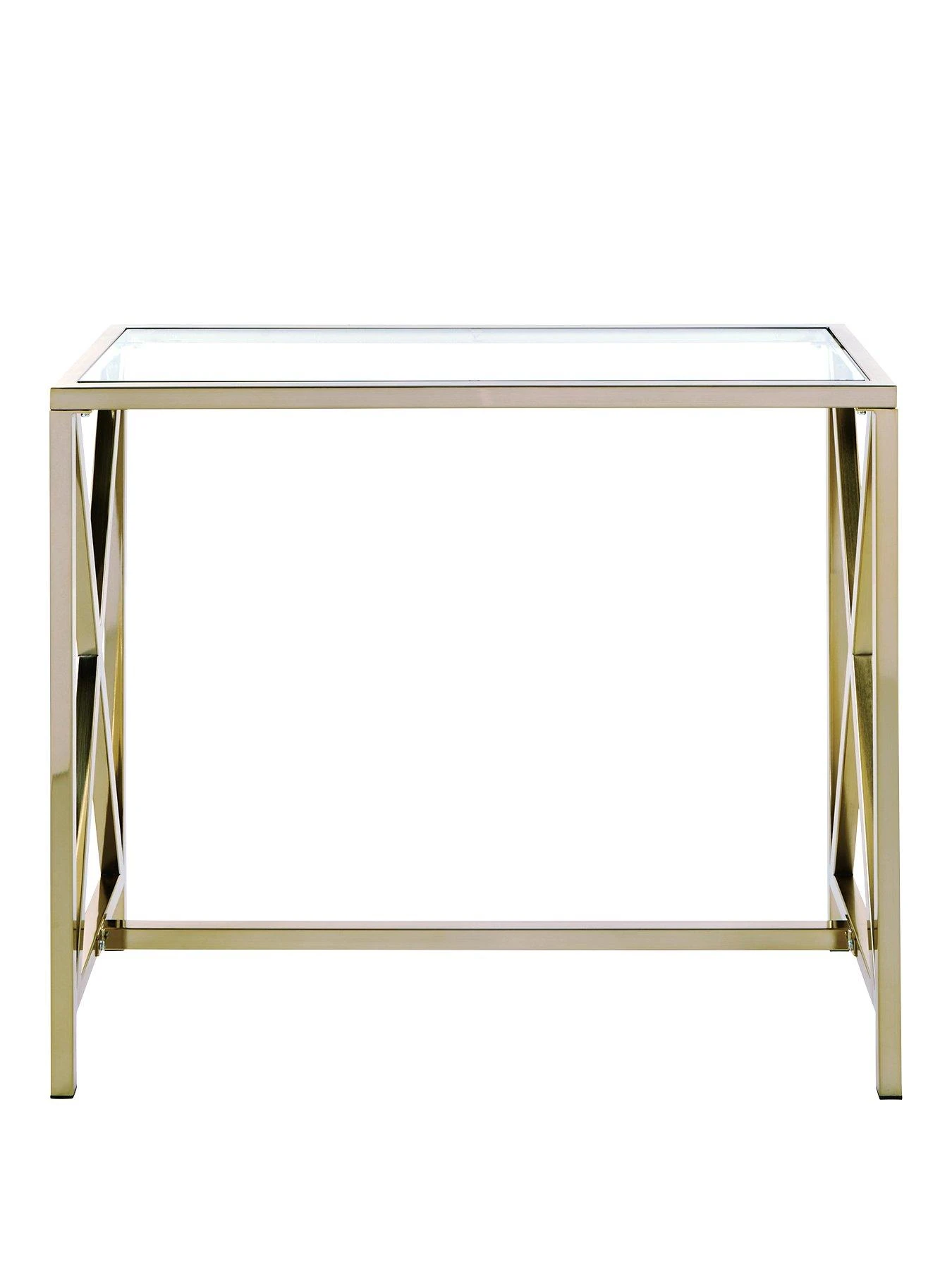 This stunning bar table from the Christie collection will add some real glitz and glam to your room. The metal frame is finished in a shiny brassĀ colour that catches the light and features a jaw-dropping X to each end.