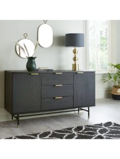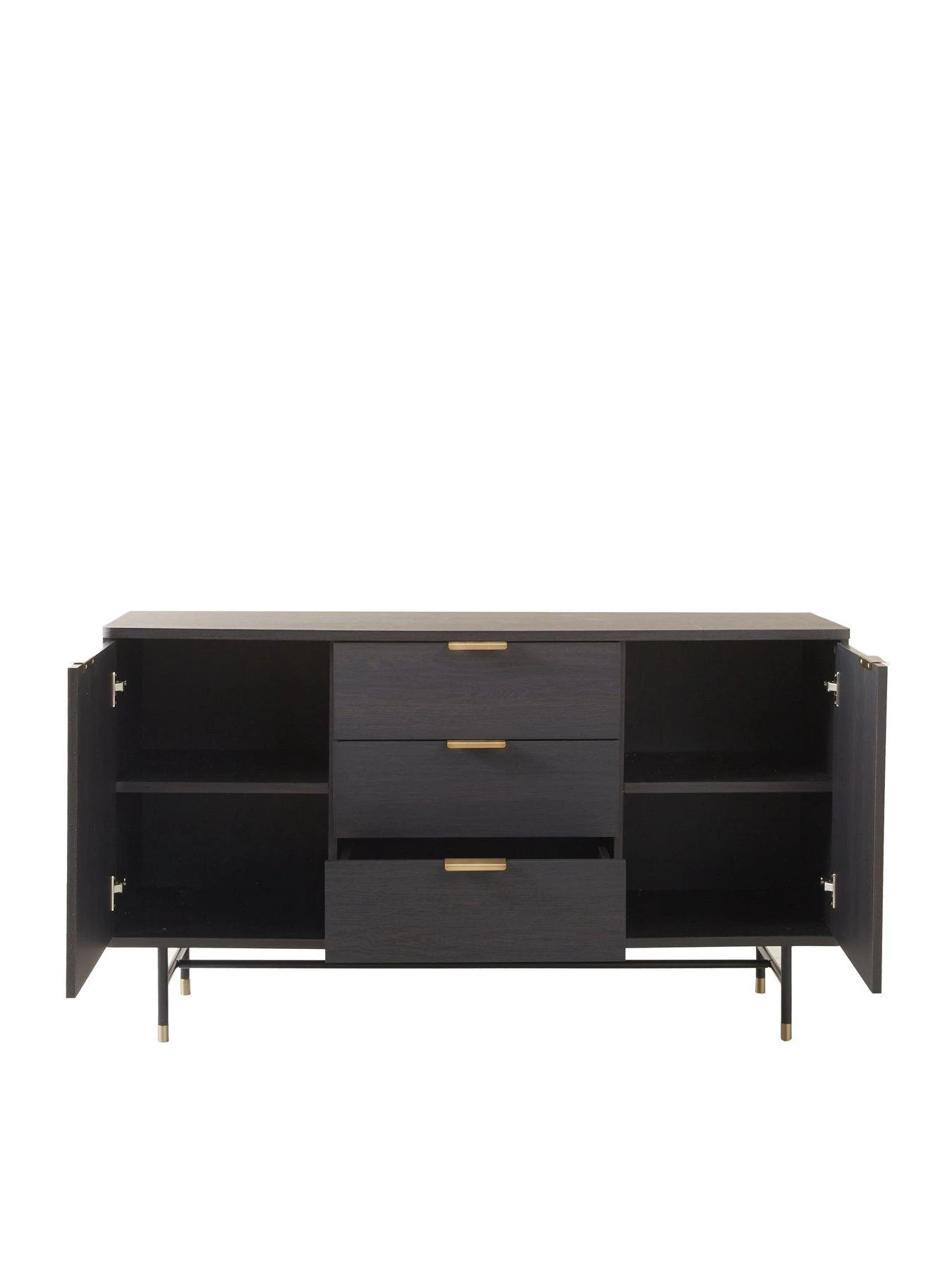 Part of our Cooper collection of living and dining room furniture, this swish sideboard has plenty of style and space to transform your home. In a richly grained walnut-effect finish, it sits on sleek metal legs that are accented with opulent gold tips.