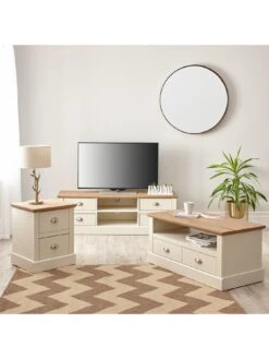 This Crawford 3 Piece Living Room Furniture Package by Very Home contains a TV Unit for televisions up to 55 inch, a 2 Drawer Coffee Table and a 2 Drawer Lamp Table