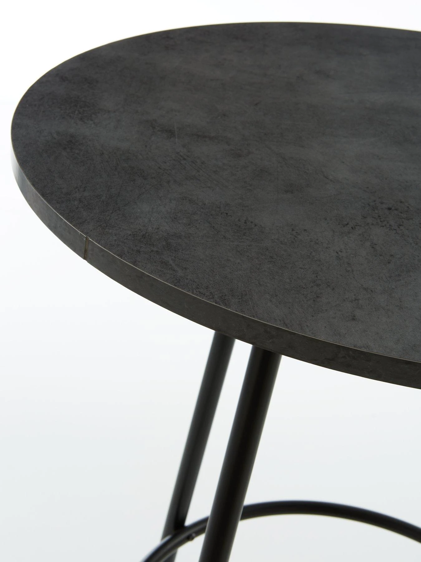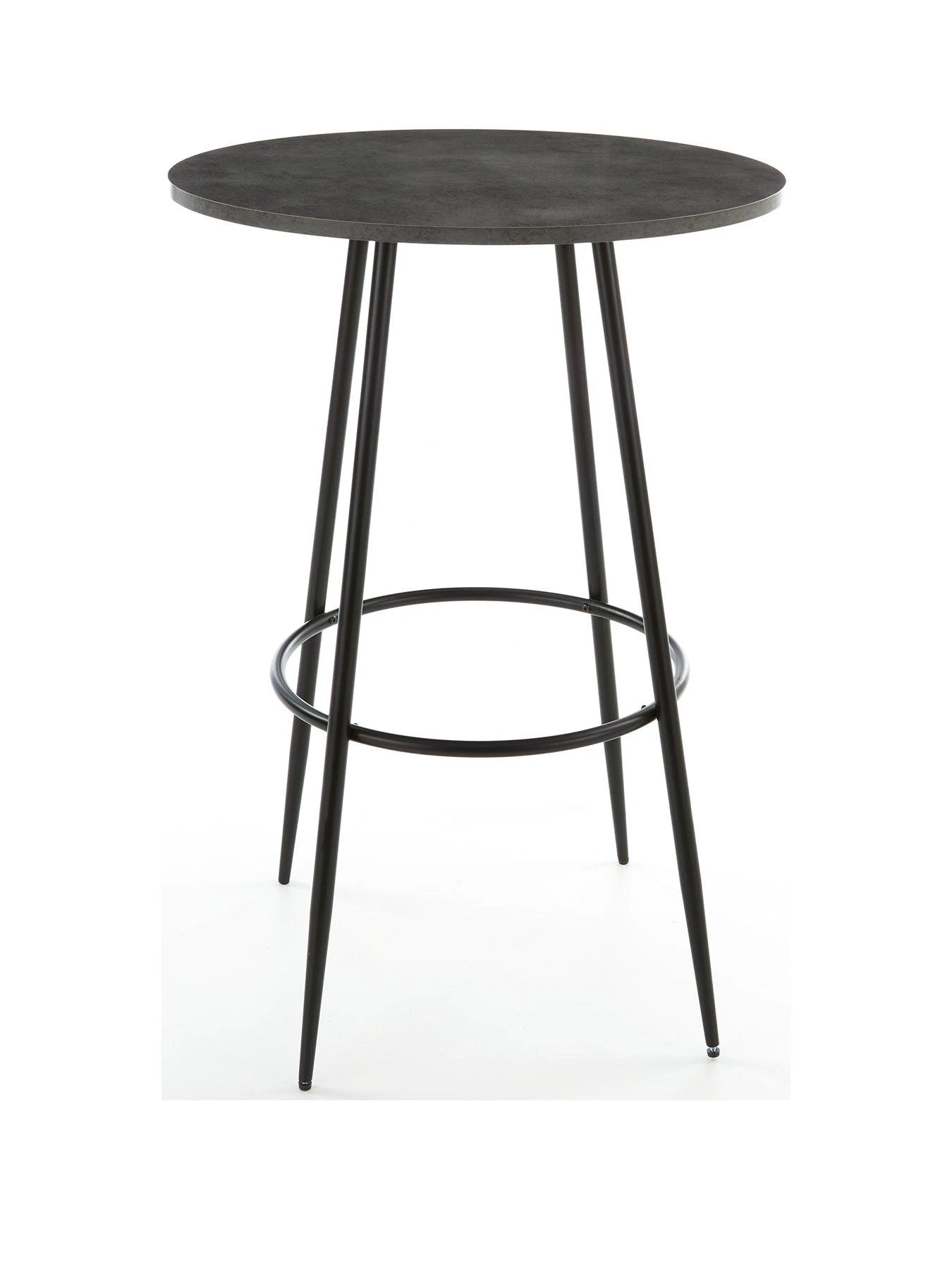 The tall table is over a metre in height and features a 25mm thick circular top which is finished in an industrial-inspired concrete effect. This is supported by black metal tube legs which benefit from a built in foot stand.