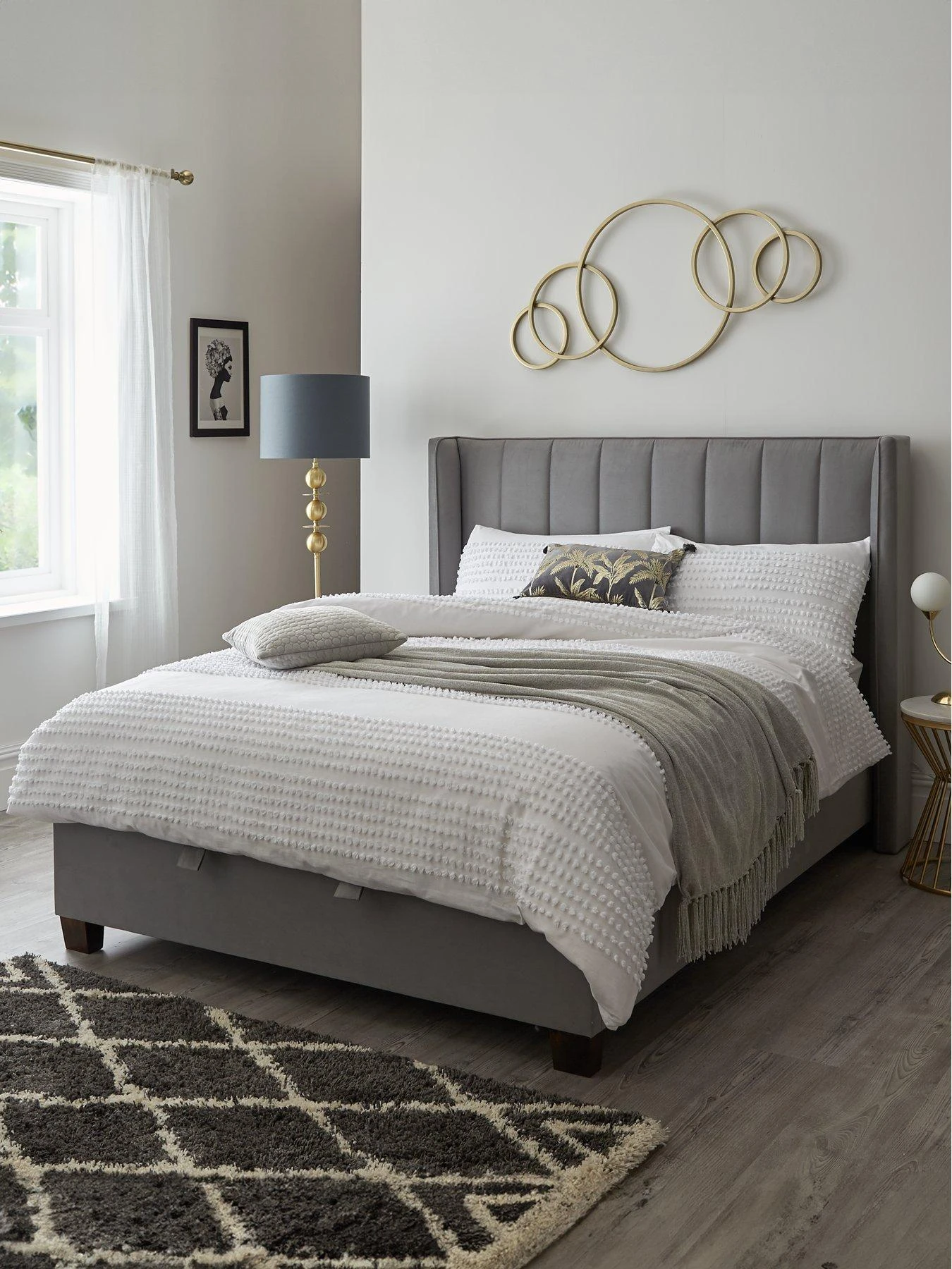 It’s upholstered in a sumptuous velvet fabric which comes in a go-with-everything grey hue, so you can match it with all sorts of bedding styles. The bed sits on smart wooden feet in a contrasting dark shade, and its mattress base can be manually lifted with the help of the hydraulic arms. This reveals a spacious storage area for all your spare bedding, and the arms will hold the mattress in a raised position until you’re ready to push it back down again.