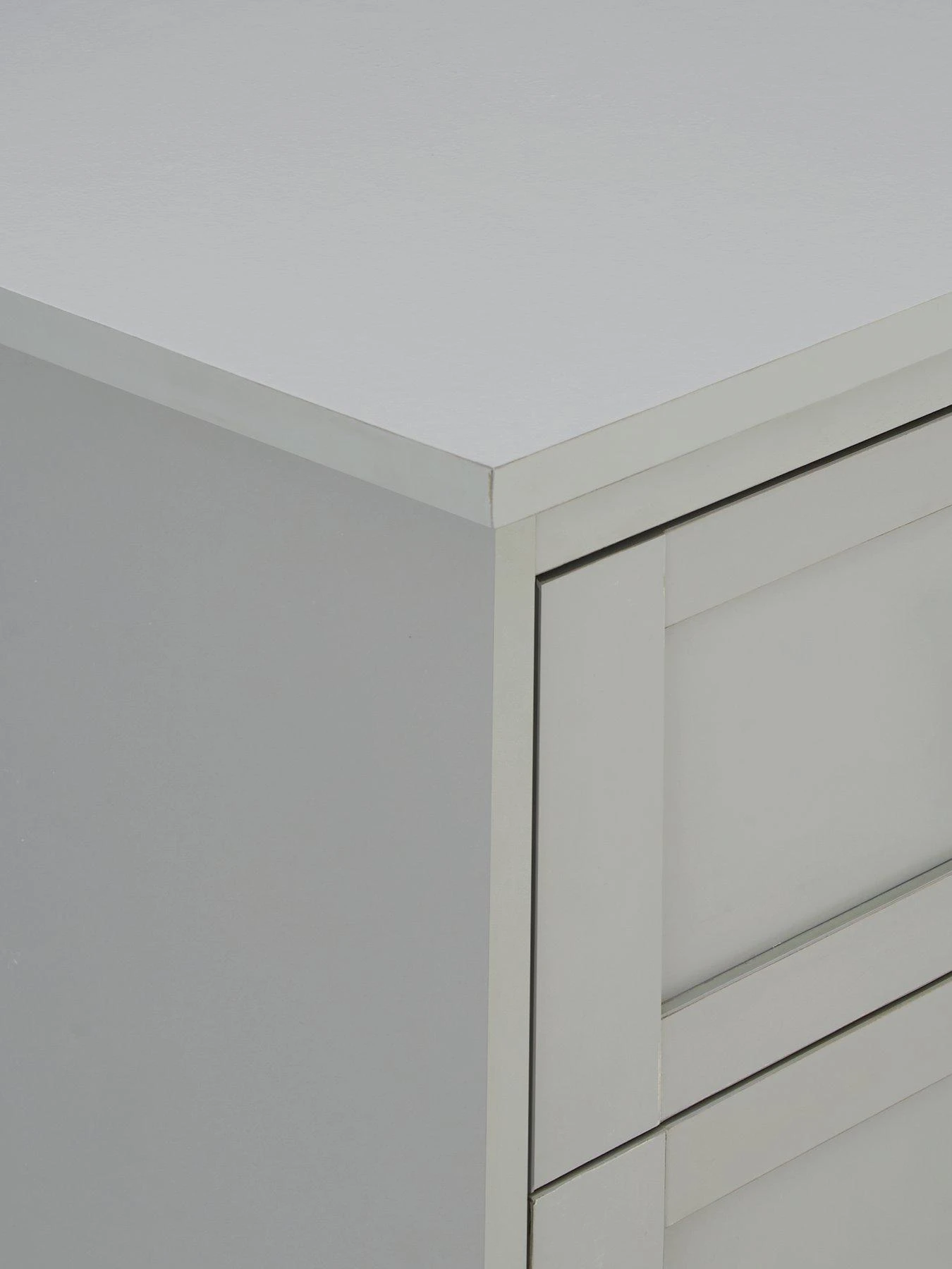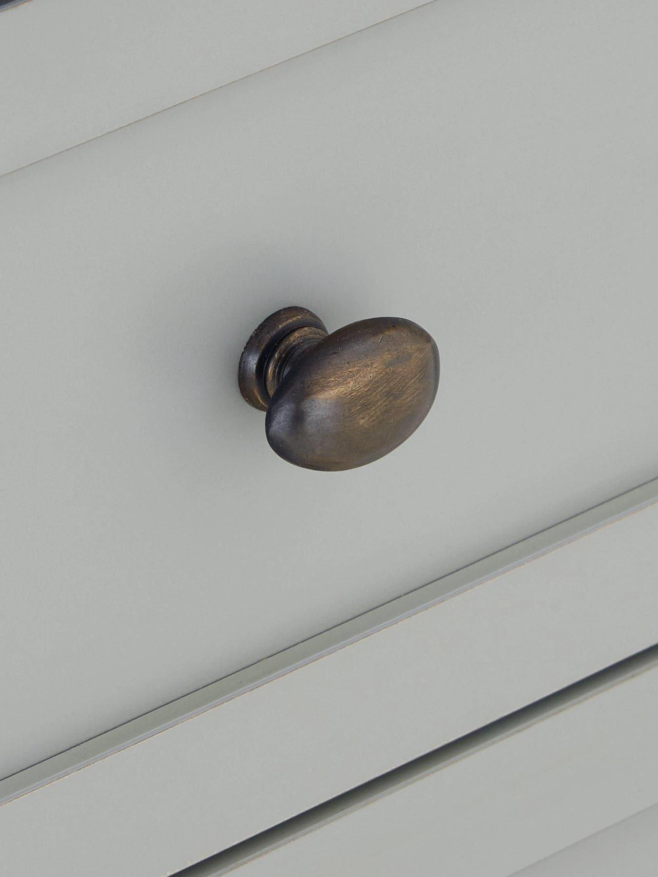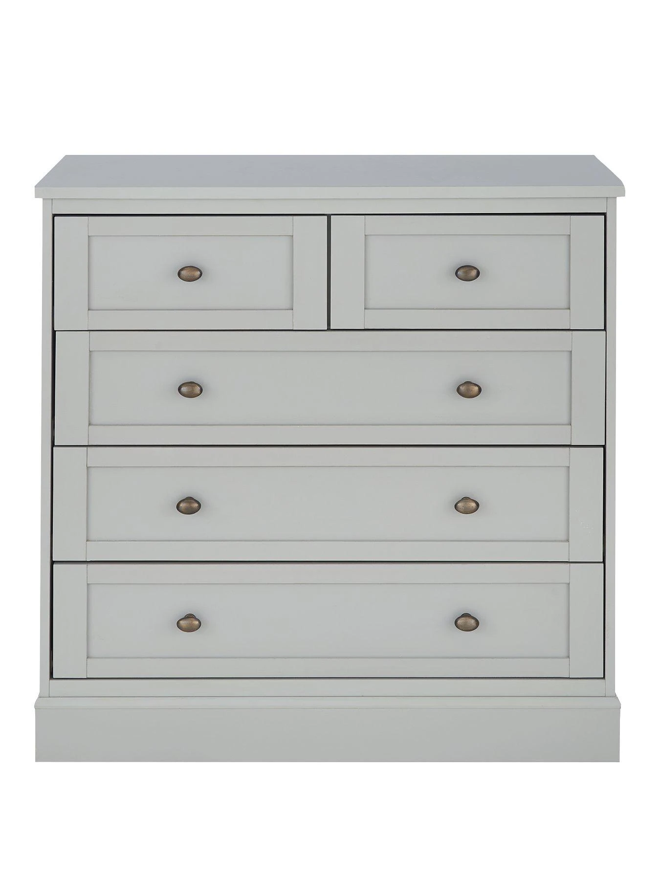 This chest of drawer from the Darcy collection is made from sturdy MDF, then wrapped in a smooth light grey finish. Sitting on a chunky plinth, its five drawers (three wide, two narrow) flaunt fashionable framing detail and they’re fitted with antique metal-effect handles and easy-glide metal runners.