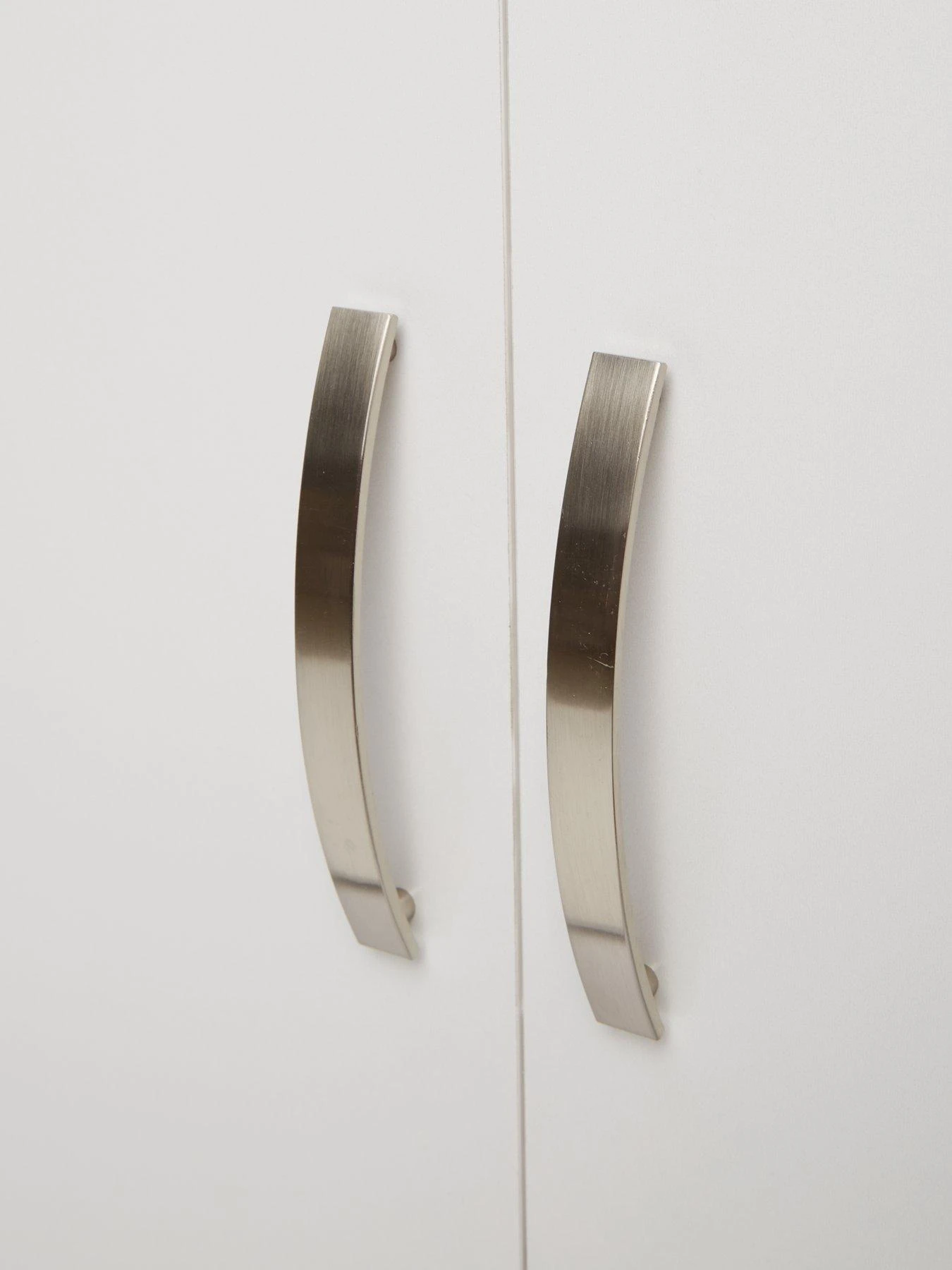 Three doors are accented with shiny curved Metal handles. Open them uo and you’ll find a wide area with a metal hanging rail and high shelf, plus a narrow side with a further 2 rails (one on top of the other) which are perfect for shorter items.
