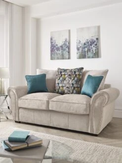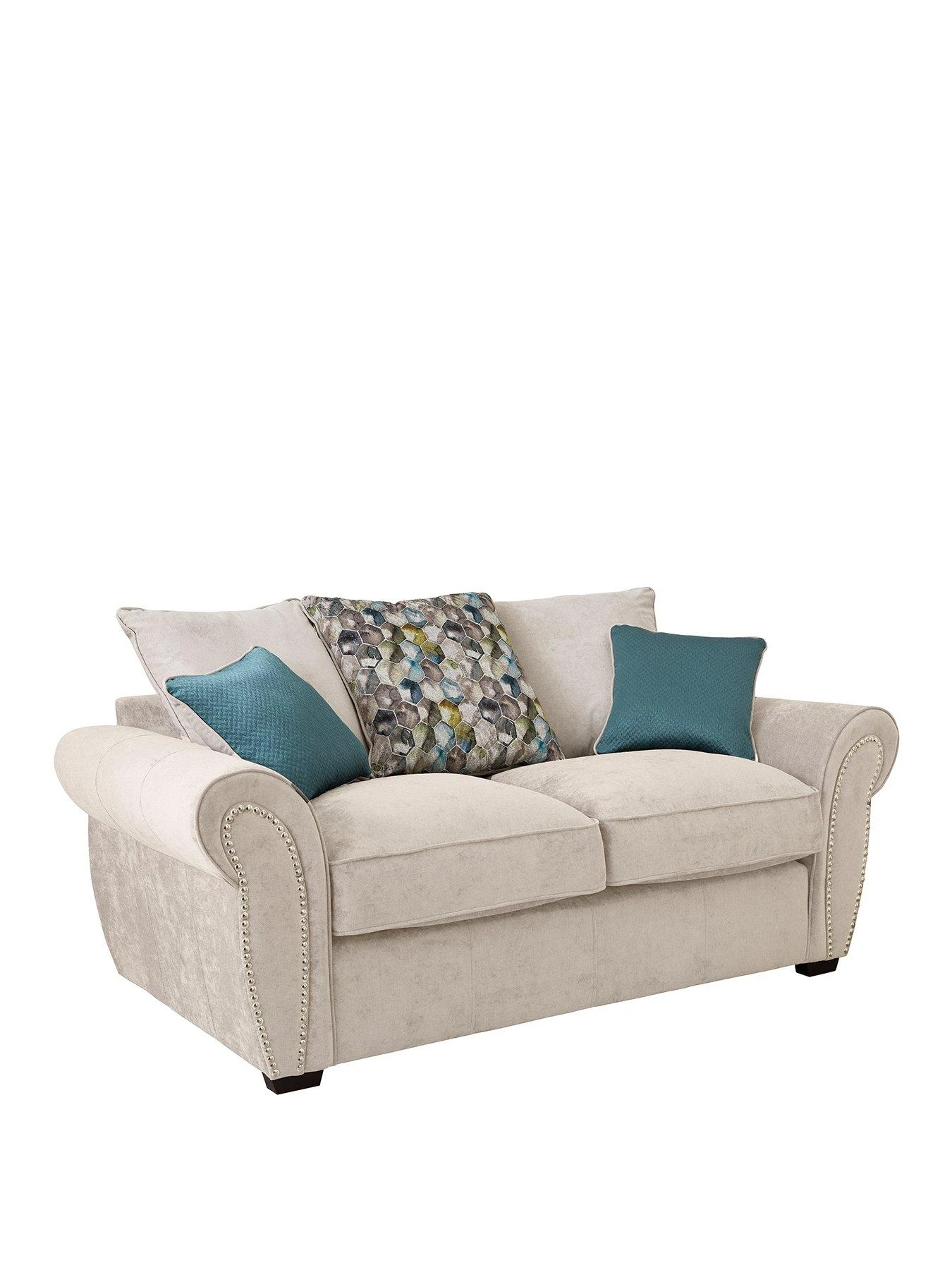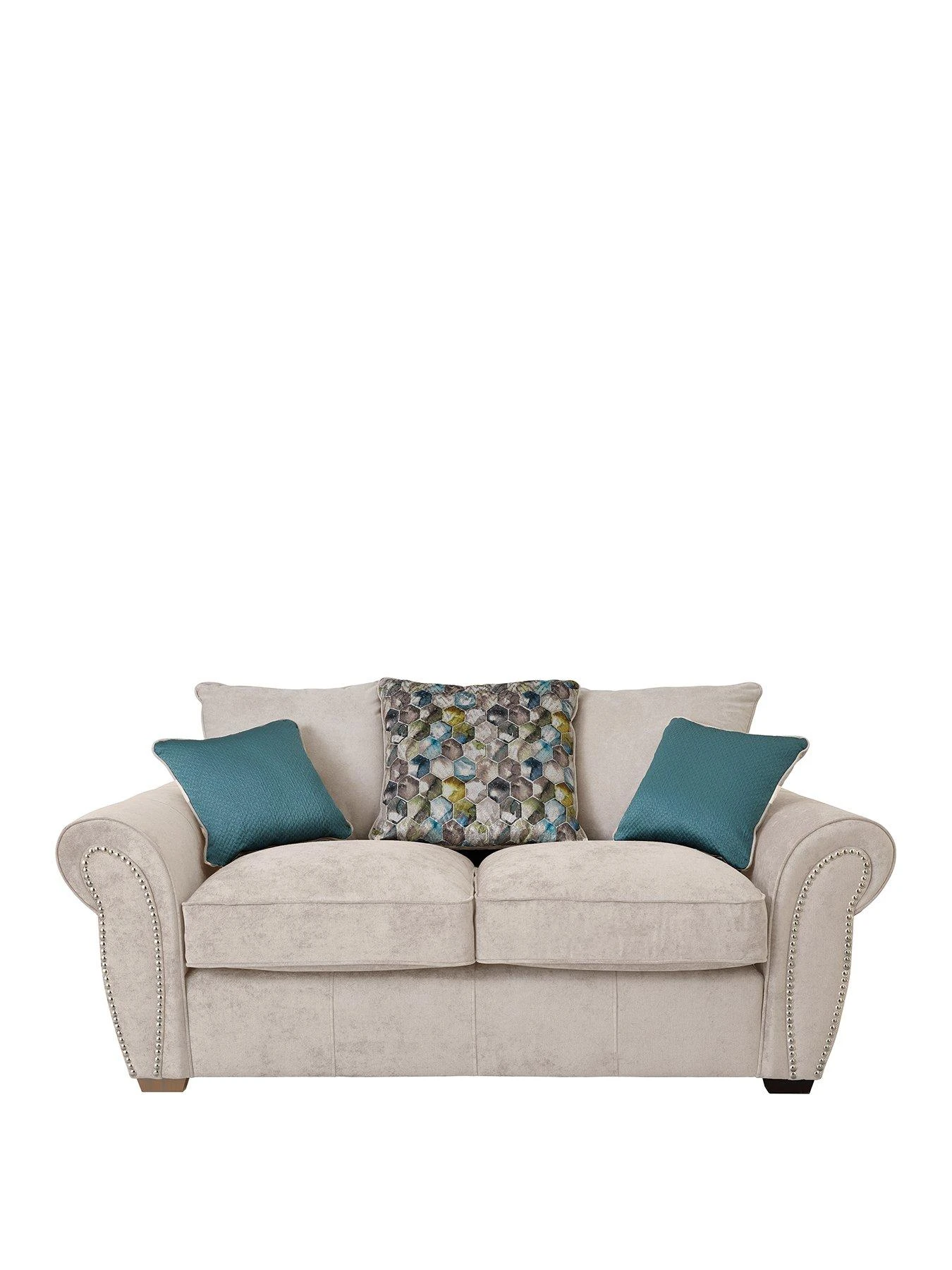 The centre scatter cushion has a stunning multi-coloured hexagonal design to one side and a plain fabric to match the sofa on the reverse, while two smaller cushions pop in a contrasting colour.