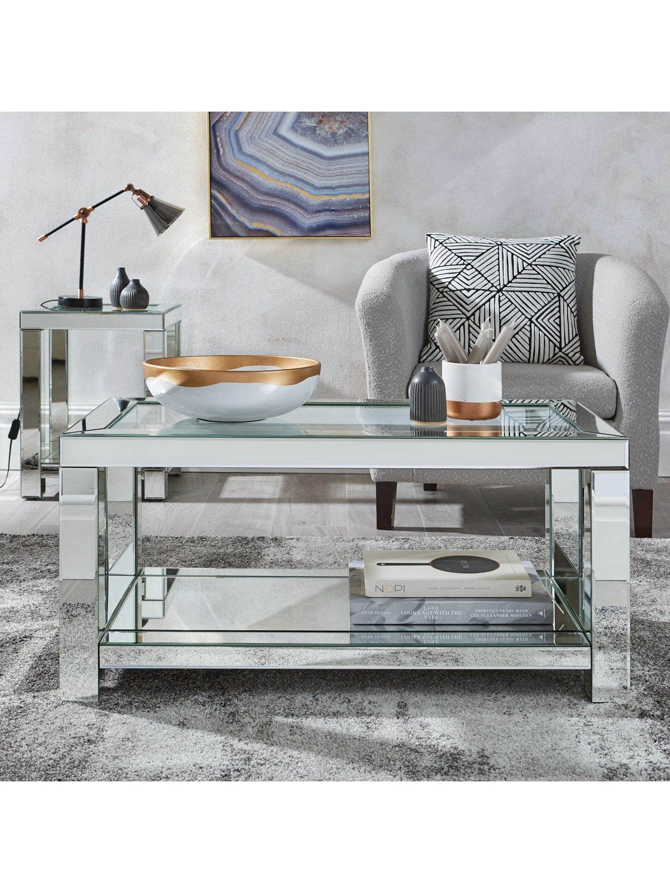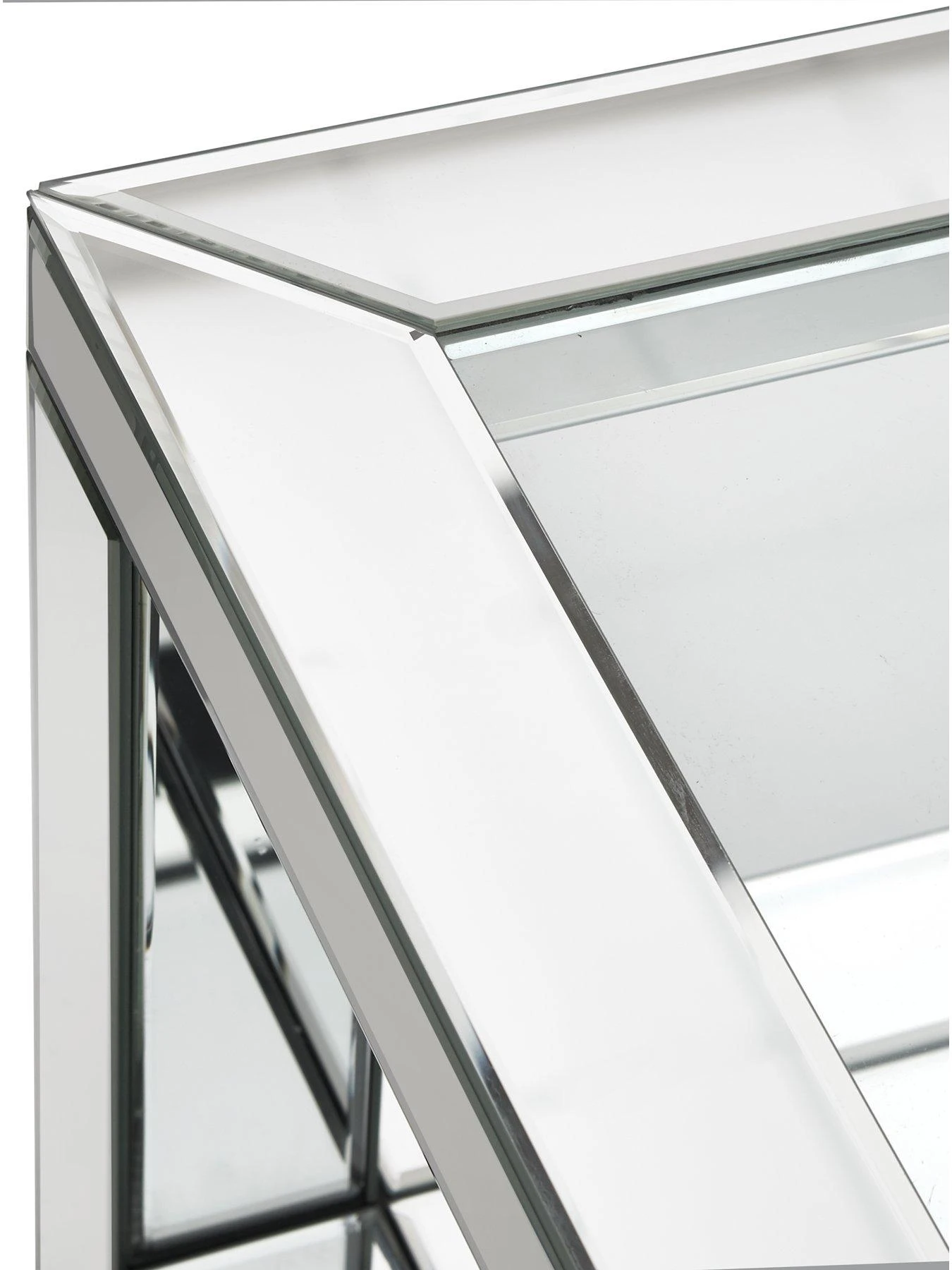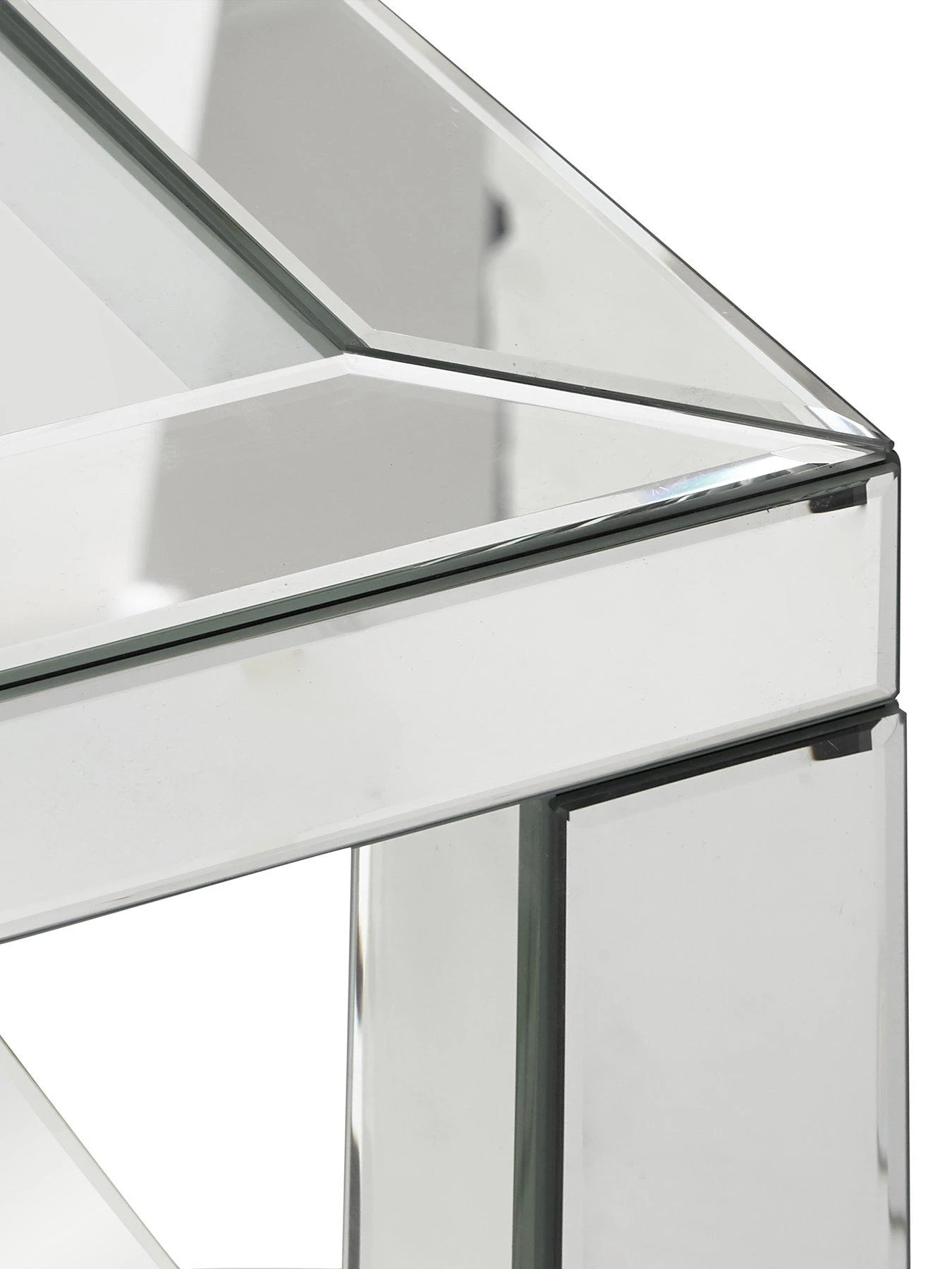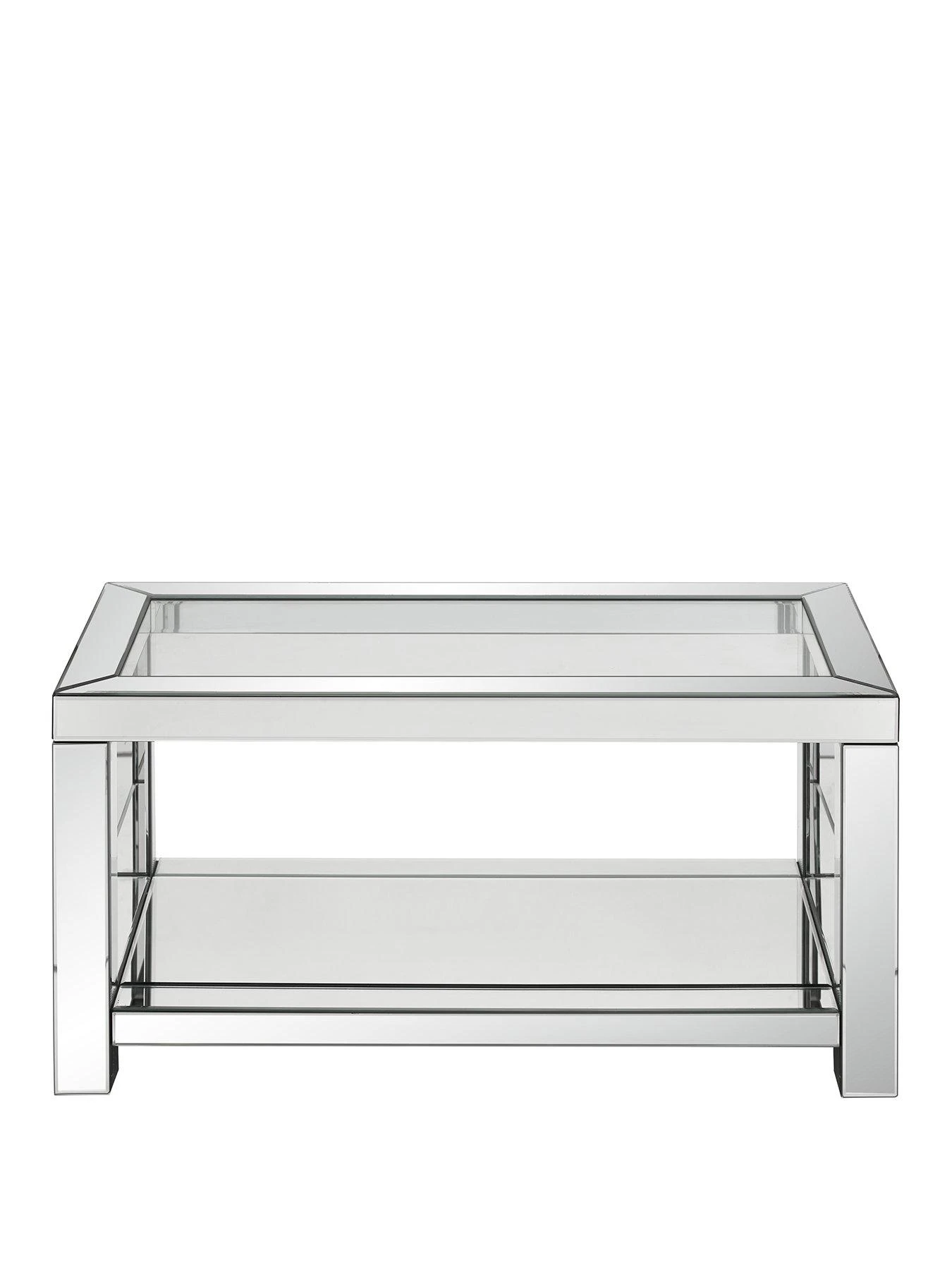 Covered in a series of sleek bevelled mirrors that catch the light and brighten your room, the top features an equally shiny tempered glass panel. The newspaper shelf keeps the top clear of magazines, remotes and other clutter.