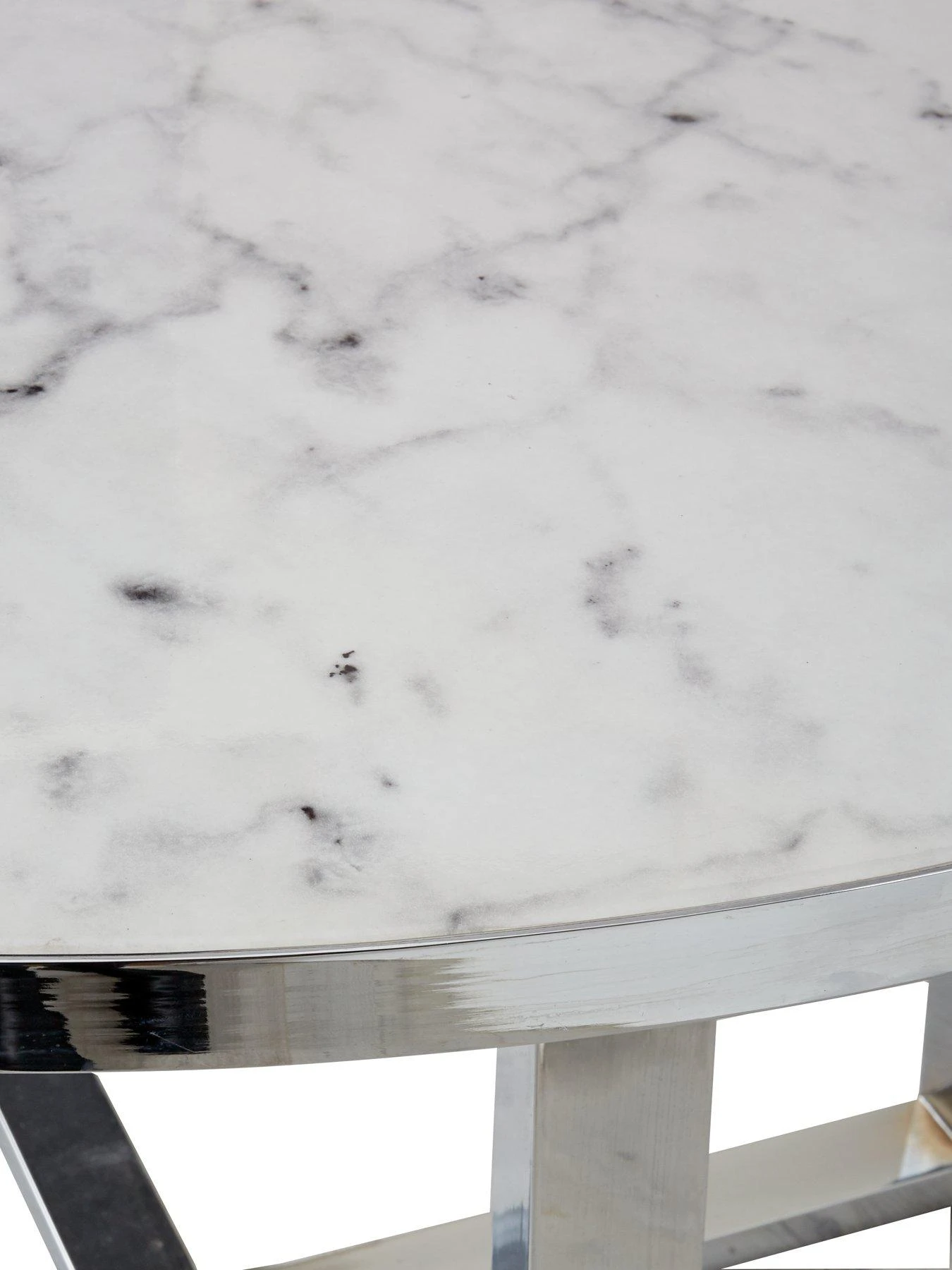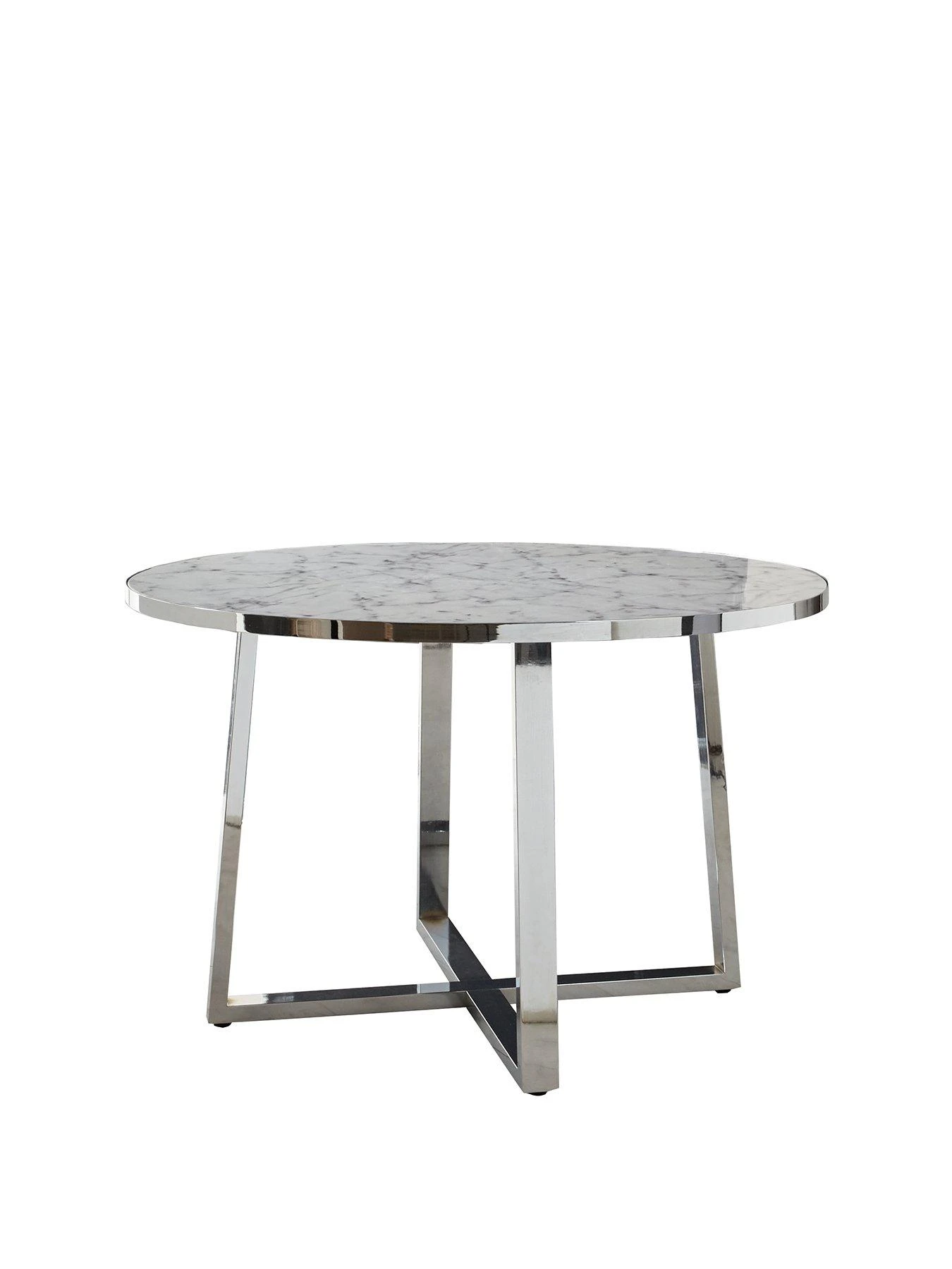 This modern dining set is built around a 120 cm round table that blends a chrome coloured metal base with a marble-effect top.