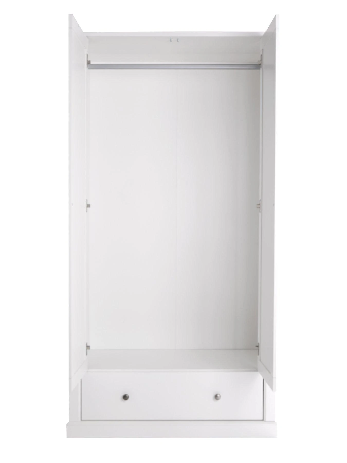 You can pick soft grey or bedroom brightening white, each of which is detailed with metal knob handles. Two framed doors open up to reveal a metal hanging rail, and the hanging space is complemented by a single drawer that opens on friction-free metal runners for a smooth action even when full.