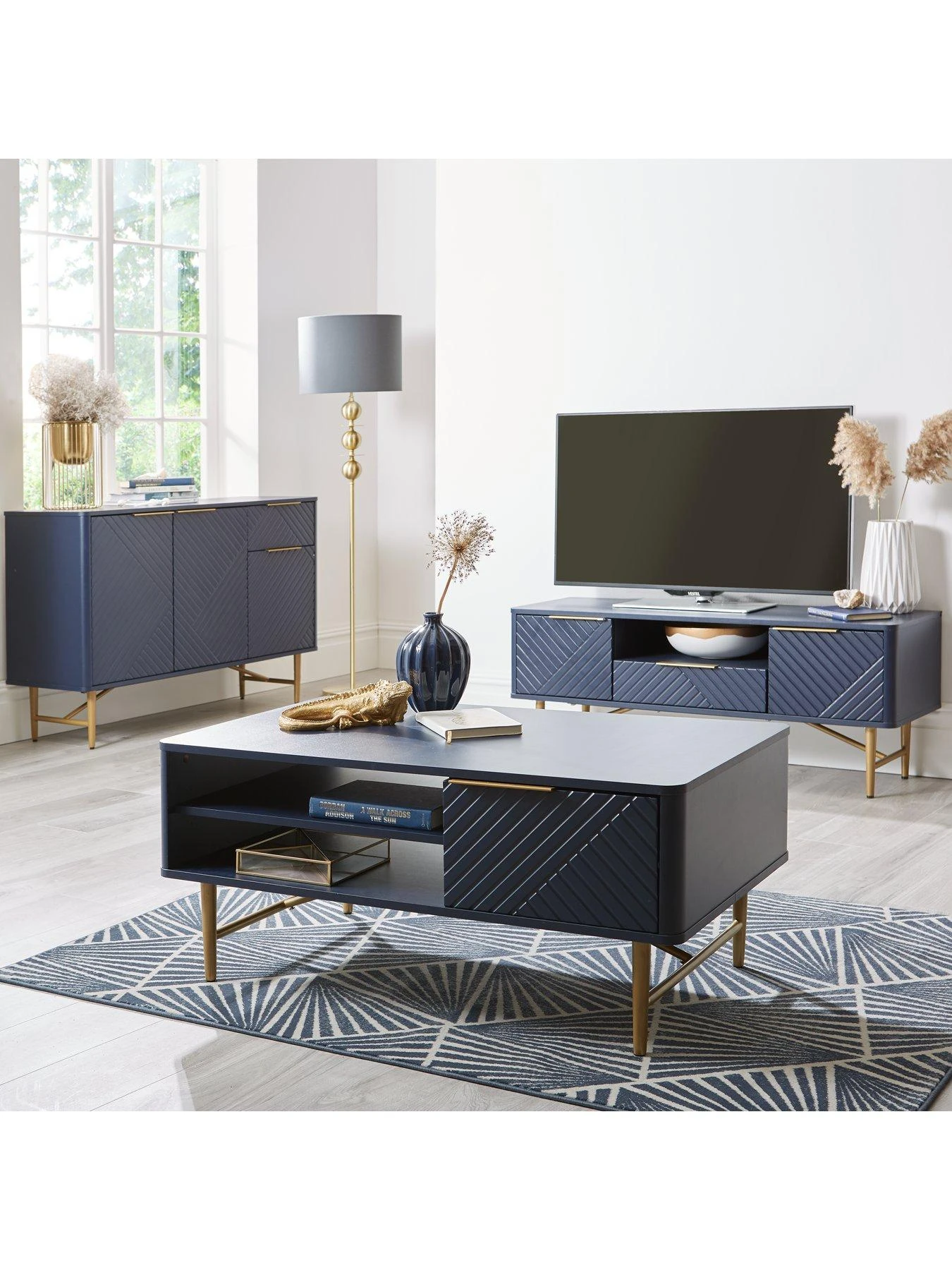 Finished in a smooth navy finish which will give your lounge an eye-catching pop of colour, its drawer front flaunts a series of angular grooves which are reminiscent of the art deco style.