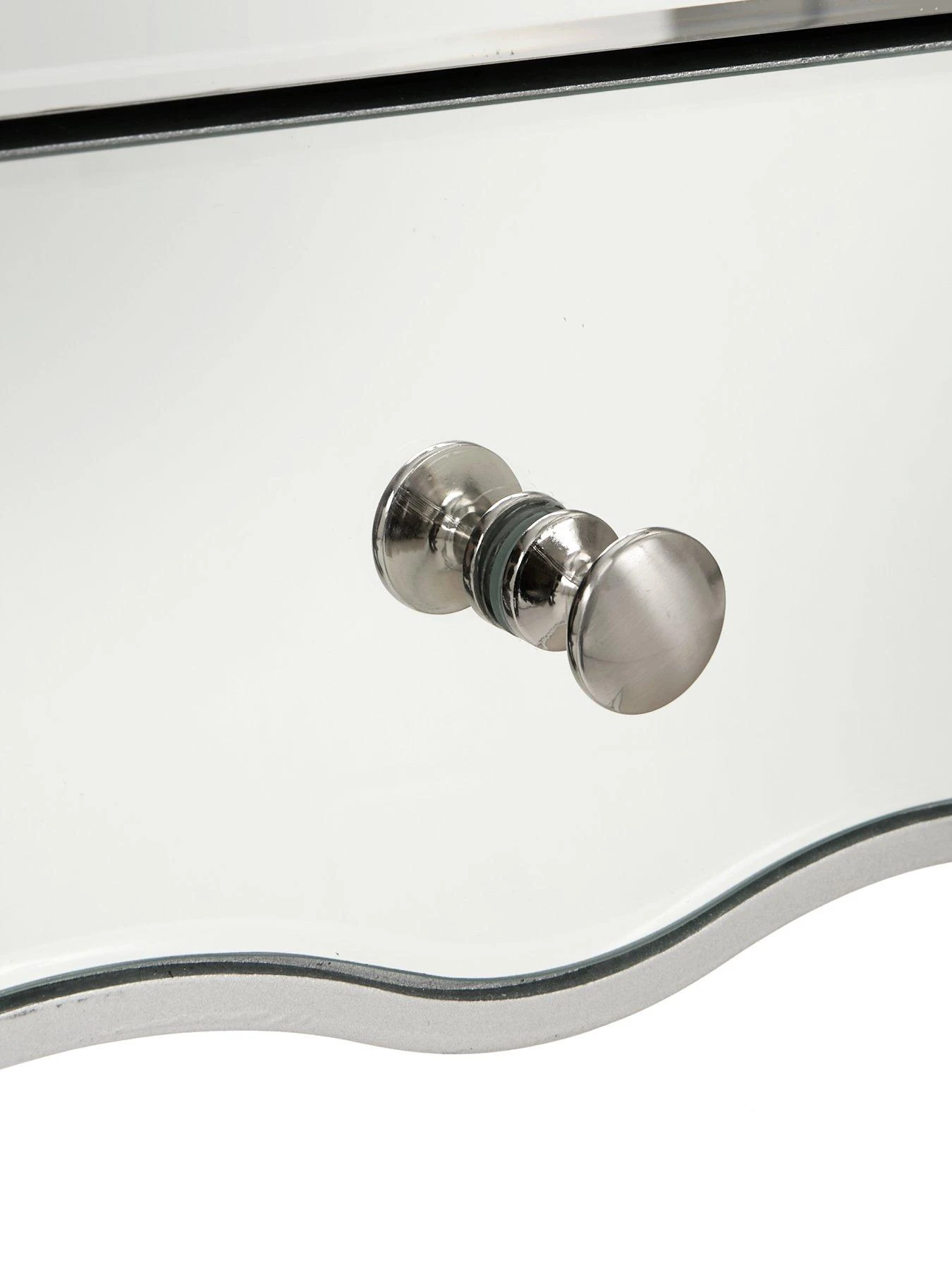 Styled with a curvy base panel and strikingly shaped legs, the glamorous silver coloured frame supports bevelled mirrored panels that splash light around your bedroom. A final touch of shine comes from the dainty metal knob handles, and the three drawers provide a handy hideaway for all your beauty essentials.