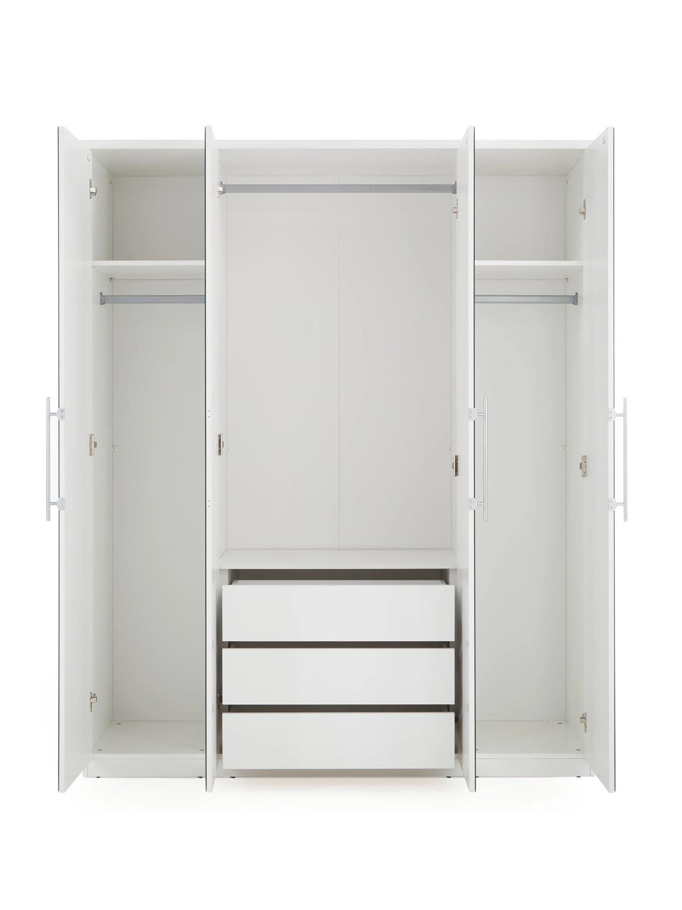 2 narrow outer sections each contain their own hanging rail and high shelf, while a wide middle section features a third hanging rail and 3 drawers for neat organisation of all your folded fashion.
