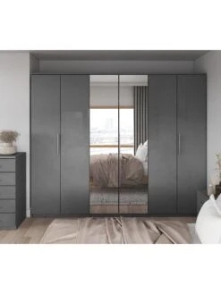 Prague Gloss 6 Door Mirrored Wardrobe with Gloss Outer Doors and a Matt Frame in Black, Grey and White – FSC® Certified