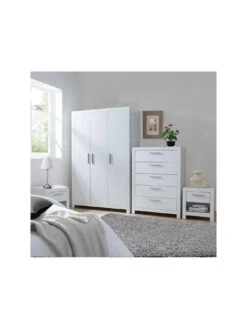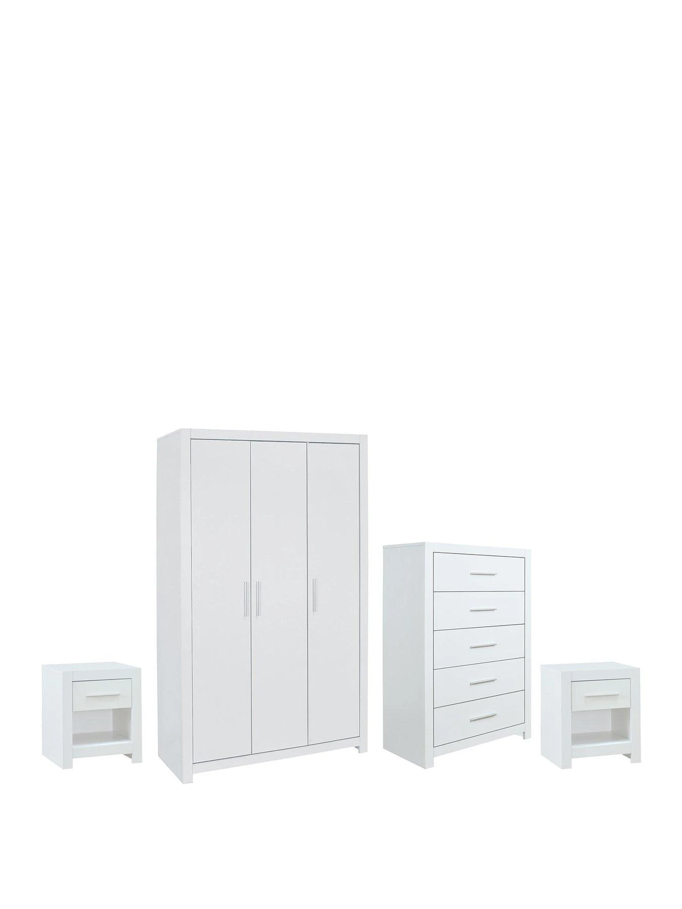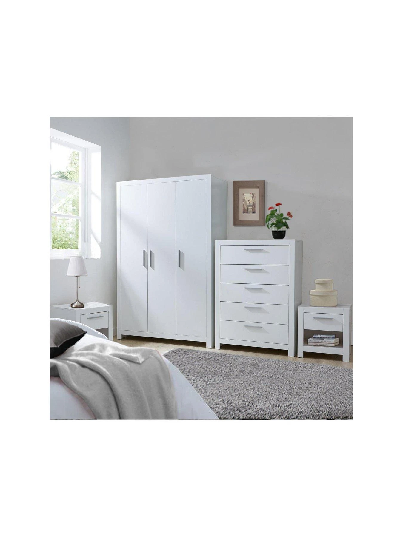 This great value 4 Piece Rio Bedroom Furniture Set by Very Home comprises a 3 Door Wardrobe, Chest of 5 Drawers and 2 Bedside Chests – Grey or White – FSC® Certified