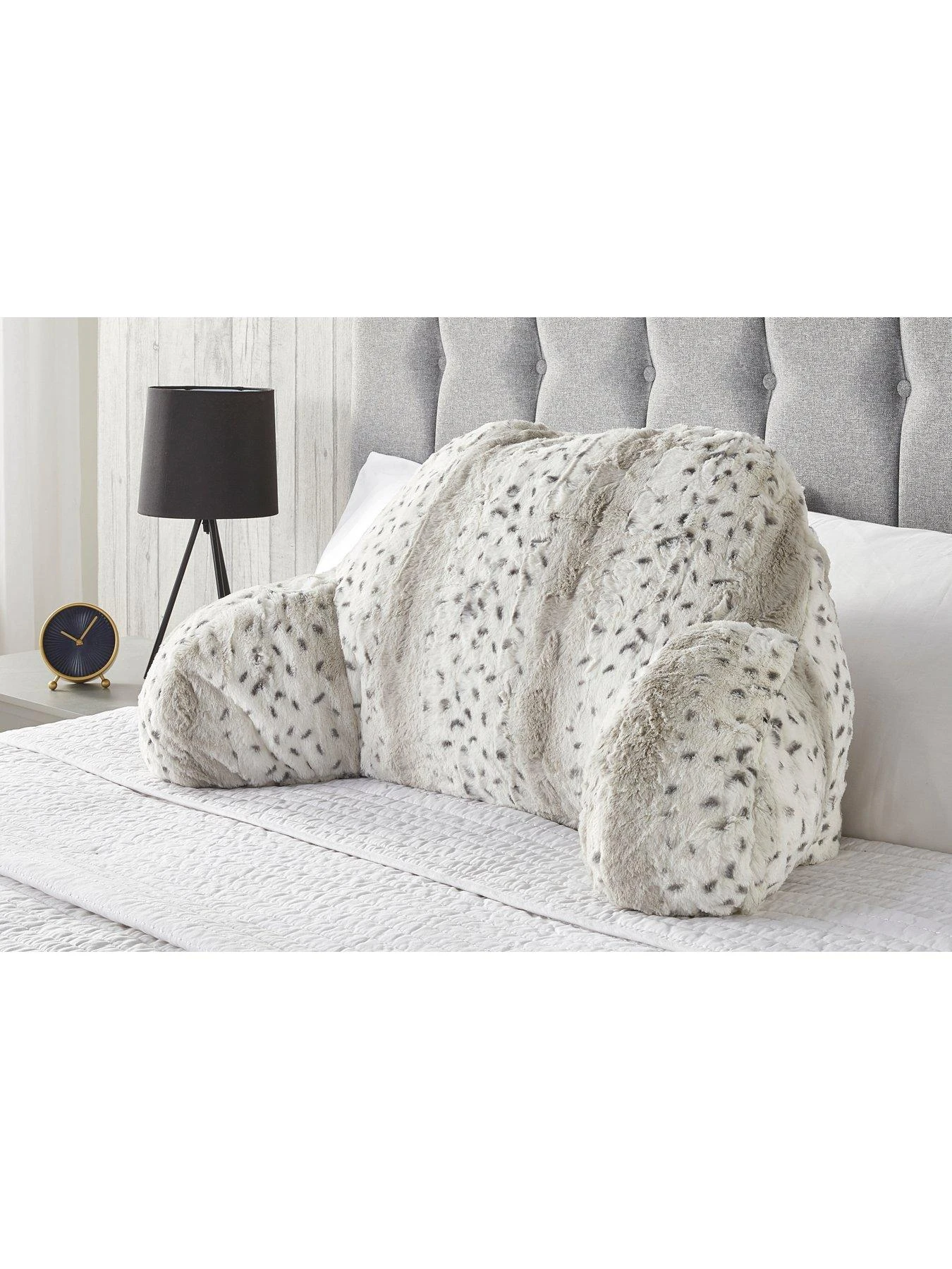 Its unique shape is perfect for propping behind you back and under your arms, so you can get extra-comfortable when settling down in bed with a good book or film. The black and white snow leopard colourway pairs a versatile palette with animal-print personality, and the fluffy texturing is irresistibly touchable.