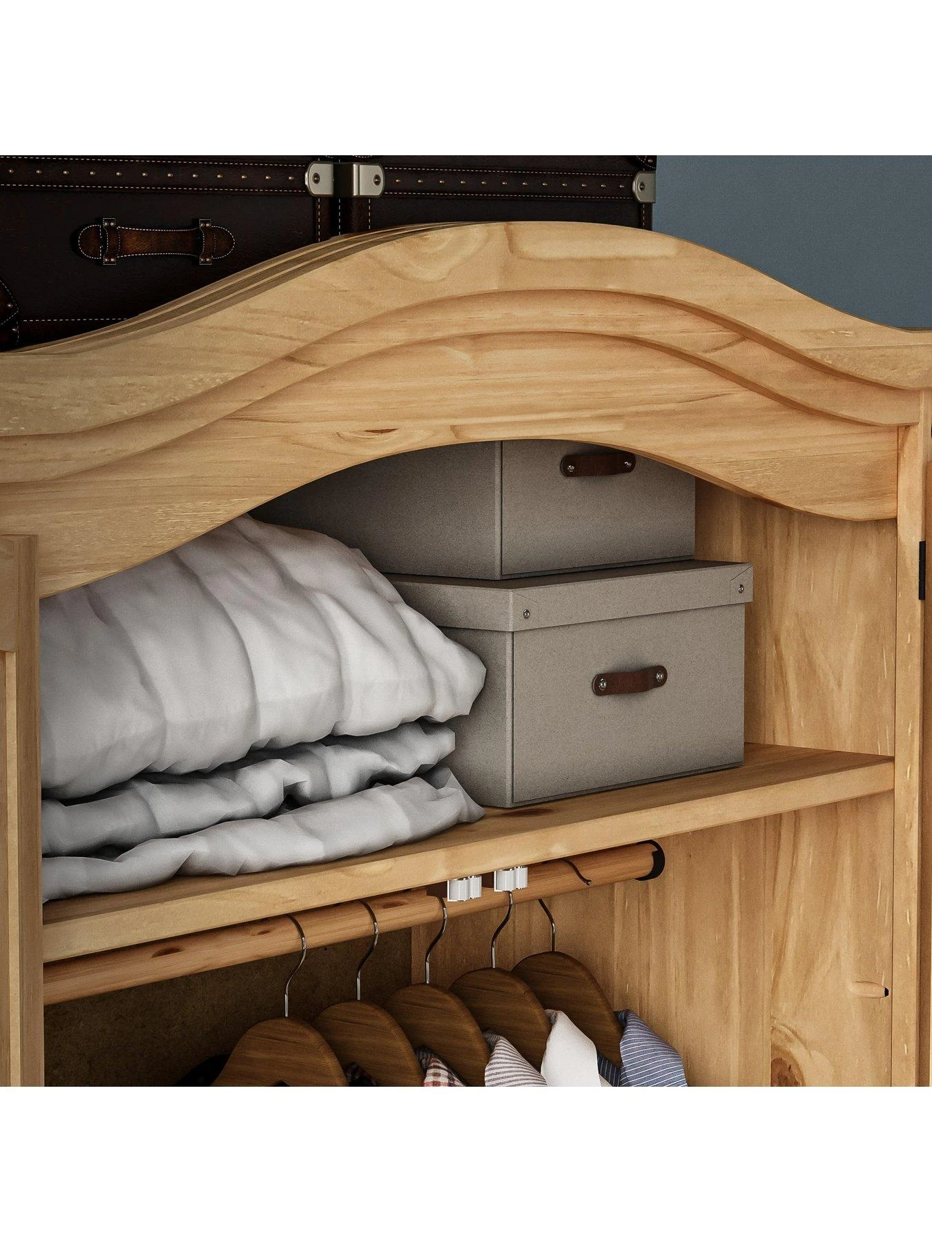 Storage is not a worry with this wardrobe, featuring a full clothing rail that spans across the wardrobe width and a shelf at the top of the wardrobe perfect for folded clothes/towels or shoes. The wardrobe features rustic metal hinges and handles which add to the wardrobes Mexican style. The bottom of the wardrobe can also be used for storing shoes or bags. This item is a part of our Corona range, match this wardrobe with our Corona drawer chest, bedside table, bed and more! Please note this item will be delivered flat packed and will require self-assembly, easy to follow instructions will be provided.
