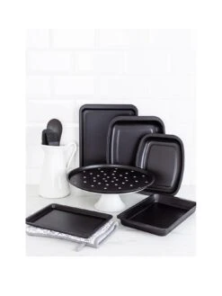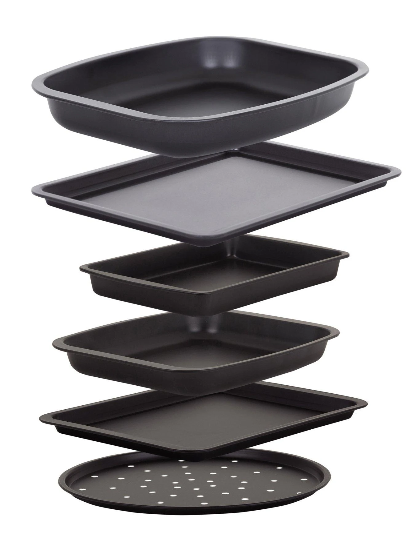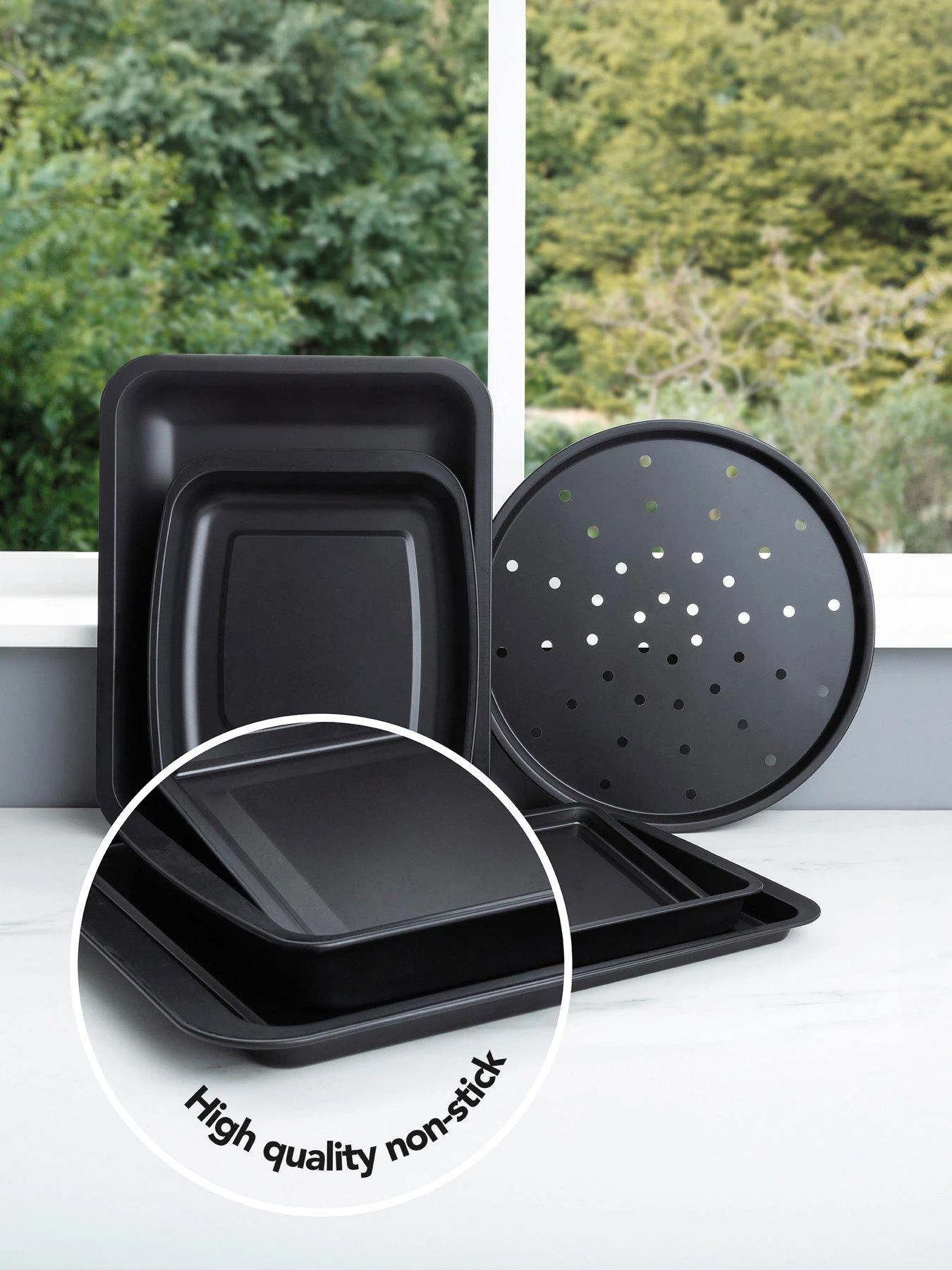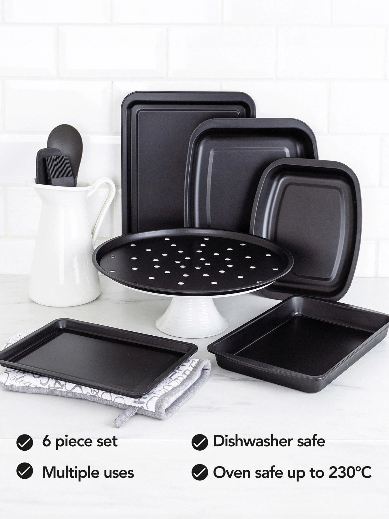 Kit out your kitchen with this six-piece Black Bakeware Set. It includes two roasting trays, three oven trays and a pizza tray, each made from steel with a robust non-stick surface. This bakeware is oven safe to 230????C and can be put in the dishwasher.