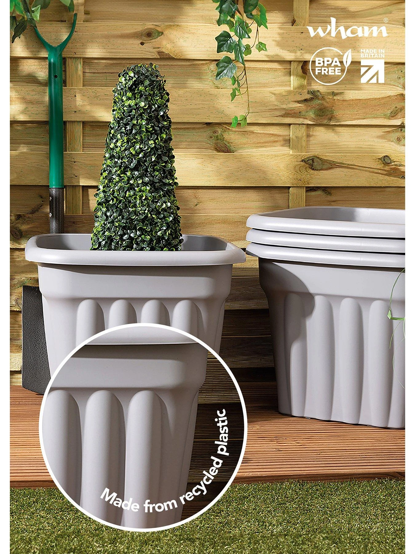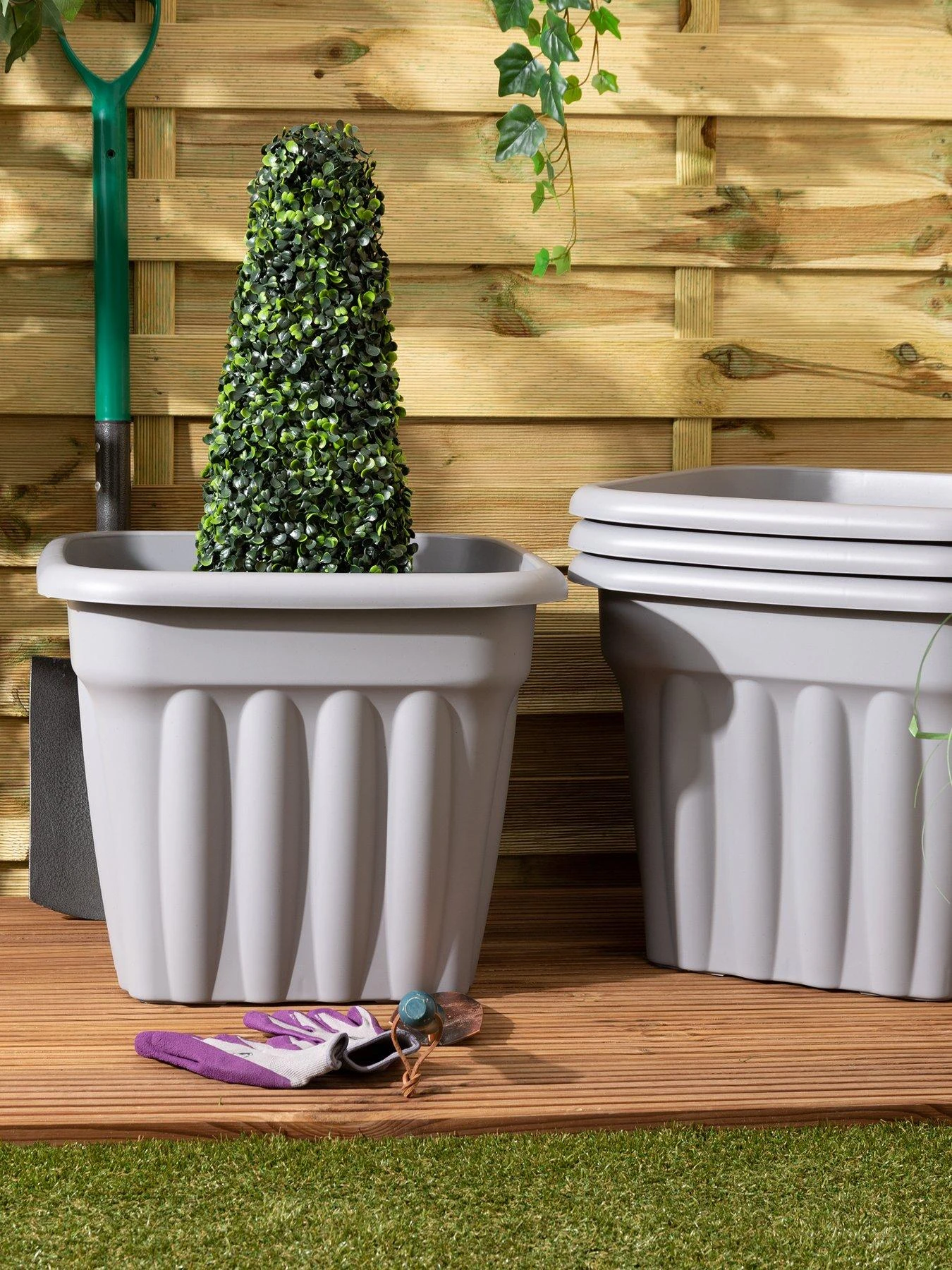 Set of 4 Traditional 49cm Square Planters in Upcycle Grey. This planter is suitable for both indoor and outdoor use being weather resistant and lightweight. Approx 50L Capacity.